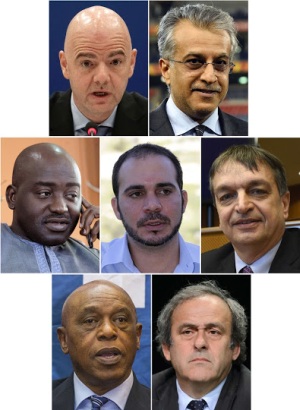 Os sete candidatos são o príncipe Ali Bin Al Hussein (Jordânia), Musa Bility (Libéria), Jérôme Champagne (França), Gianni Infantino (Suíça), Michel Platini (França), o xeque Salman Bin Ebrahim Al Khalifa (Bahrein) e Tokyo Sexwale (África do Sul).