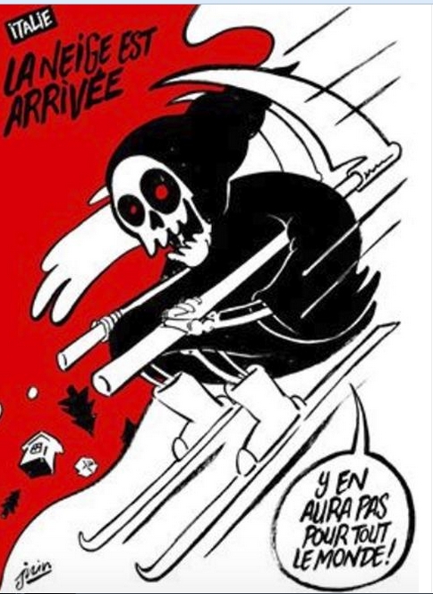 Divulgado na última quinta-feira (19), o desenho retrata a "morte" descendo de esqui com duas foices no lugar dos bastões. A legenda diz: "Itália, a neve chegou, mas não será para todos". Em setembro do ano passado, o jornal já havia feito piada com o terremoto que devastou a cidade italiana de Amatrice.
