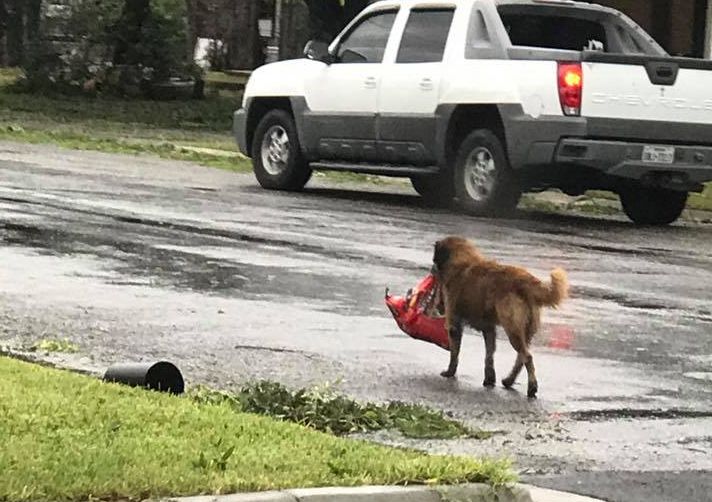 [FOTO1] A imagem de um cachorro carregando um saco de ração pelas ruas, após a passagem do furacão Harvey, nos Estados Unidos, está fazendo um verdadeiro sucesso na web.