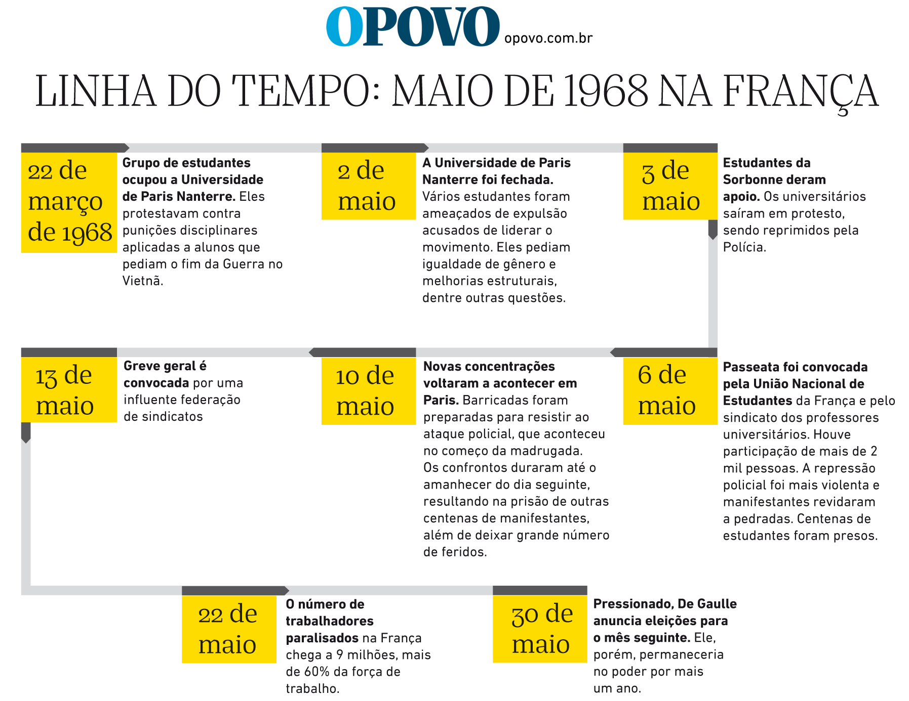 A socióloga e historiadora Dulce Pandolfi, em entrevista ao O POVO Online, concorda que os movimentos de maio de 68 marcaram o século XX. “Foi emblemático. Você ainda tem nesse ano manifestações nos EUA e em países da América Latina, incluindo o Brasil. Mas no contexto local, era decorrente do golpe de 1964. A ditadura era nosso plano de fundo”, explica.