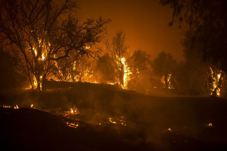 Muitas oliveiras, emblemáticas da ilha mediterrânea, não são mais do que esqueletos e brasas ainda fumegantes eram visíveis da estrada.