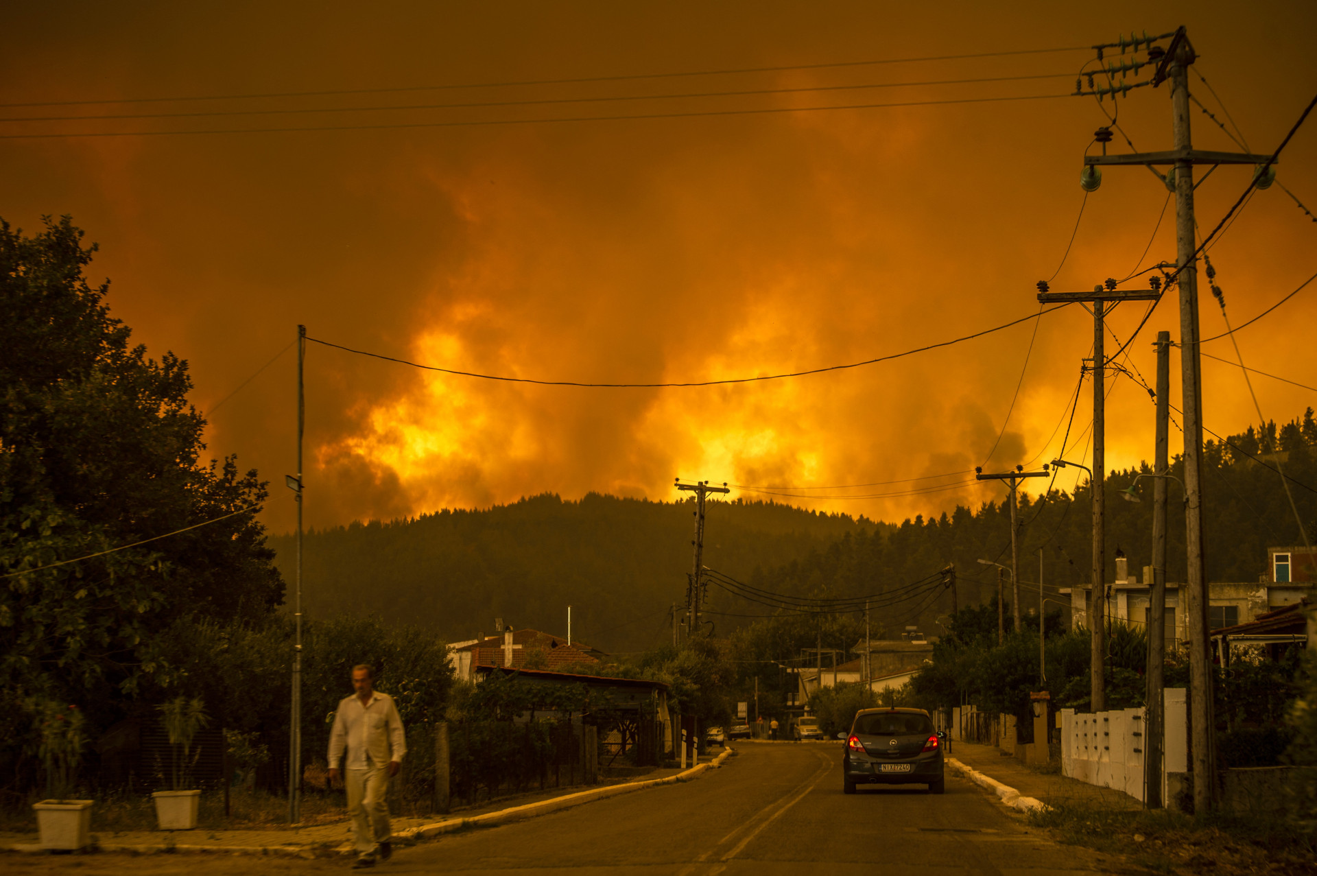 Milhares de hectares de florestas de pinheiros foram destruídos por um incêndio em Eubeia, a segunda maior ilha da Grécia, localizada cerca de 200 km a leste de Atenas.