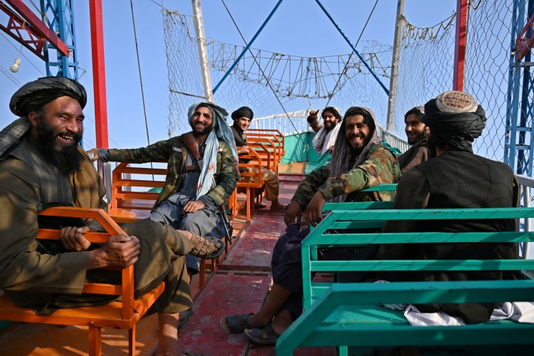 "Isto é o Afeganistão", grita com alegria um combatente talibã ao sentar em um barco pirata com alguns colegas de armas em um parque de diversões ao oeste de Cabul.