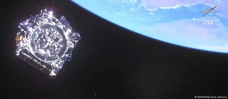 Custando 9 bilhões de dólares e 30 anos após o início de sua construção, telescópio começou jornada rumo ao seu destino a 1,5 milhão de quilômetros da Terra. Instrumento fornecerá dados sobre os primórdios do universo.O telescópio espacial mais poderoso do mundo, o James Webb, decolou neste sábado (25/12) da Terra, após vários atrasos causados por problemas técnicos. Três décadas depois do começo de sua construção, o revolucionário telescópio infravermelho de 9 bilhões de dólares partiu no alto do compartimento de carga do foguete Ariane 5, da Base de lançamento da Agência Espacial Europeia (ESA), na Guiana Francesa. O lançamento impecável do dia de Natal, com uma contagem regressiva conduzida em francês, foi transmitido ao vivo em um webcast conjunto entre a Nasa e a Esa. Depois de 27 minutos de viagem, o instrumento foi desacoplado do estágio superior do foguete construído na França e deve gradualmente se desdobrar até quase o tamanho de uma quadra de tênis ao longo dos próximos 13 dias, enquanto navega ao seu destino. O telescópio viajará até se situar a 1,5 milhão de quilômetros da Terra, quatro vezes mais longe que a Lua, e de lá oferecerá uma visão inédita do universo. Para se ter uma ideia, o Hubble, maior telescópio em operação, está a 600 quilômetros da Terra desde 1990, entrando e saindo da sombra do planeta a cada 90 minutos. A localização da órbita do James Webb é chamada de ponto Lagrange 2 e foi escolhida, em parte, porque manterá a Terra, o Sol e a lua todos no mesmo lado de seu escudo solar. O telescópio é resultado de uma colaboração entre a Nasa, a Esa e a Agência Espacial do Canadá (CSA). A previsão é de que demore um mês para chegar ao seu destino e que comece a operar com toda sua capacidade em junho de 2022. Começo do universo Espera-se que o James Webb envie à Terra novas informações que ajudarão os cientistas a entender mais sobre as origens do universo e de planetas semelhantes à Terra, além do nosso sistema solar. Nomeado em homenagem a um ex-diretor da Nasa, o James Webb segue os passos do lendário Hubble - mas pretende mostrar aos humanos como o Universo era ainda mais perto de seu nascimento, quase 14 bilhões de anos atrás. Falando nas redes sociais, um dos cofundadores do projeto Webb, John Mather, descreveu a sensibilidade sem precedentes do telescópio: "Pode ver a assinatura de calor de uma abelha à distância da Lua". Todo esse poder é necessário para detectar o brilho fraco emitido há bilhões de anos pelas primeiras galáxias a existir e pelas primeiras estrelas em formação. Tamanho incomparável O telescópio é incomparável em tamanho e complexidade. Seu espelho mede 6,5 metros de diâmetro - três vezes o tamanho do espelho do Hubble - e é feito de 18 seções hexagonais. Além de examinar a formação das primeiras estrelas e galáxias do universo, os astrônomos estão ansiosos para estudar buracos negros supermassivos, que se acredita ocuparem os centros de galáxias distantes. Os instrumentos do James Webb também o tornam ideal para procurar evidências de atmosferas que supostamente possam sustentar vida em dezenas de exoplanetas recentemente documentados - corpos celestes orbitando estrelas distantes - e para observar mundos muito mais próximos de casa, como Marte e a lua gelada de Saturno, Titã. le (afp, reuters, efe, ots)