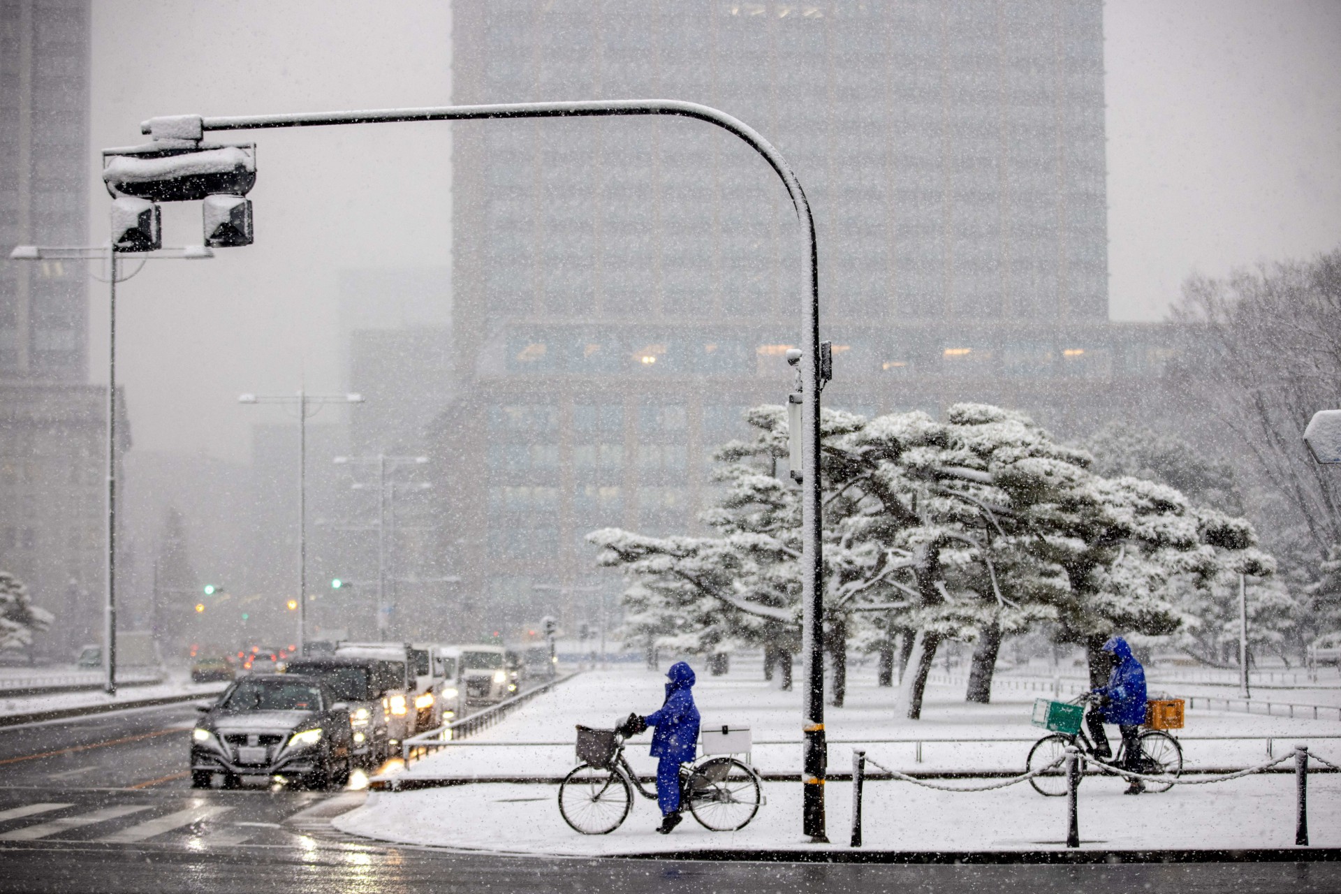 Os moradores saíram com guarda-chuvas e empurraram suas bicicletas quando a neve começou a cair. A Agência Meteorológica do Japão (AMJ) alertou que até 10 cm de neve podem cair em 12 horas.