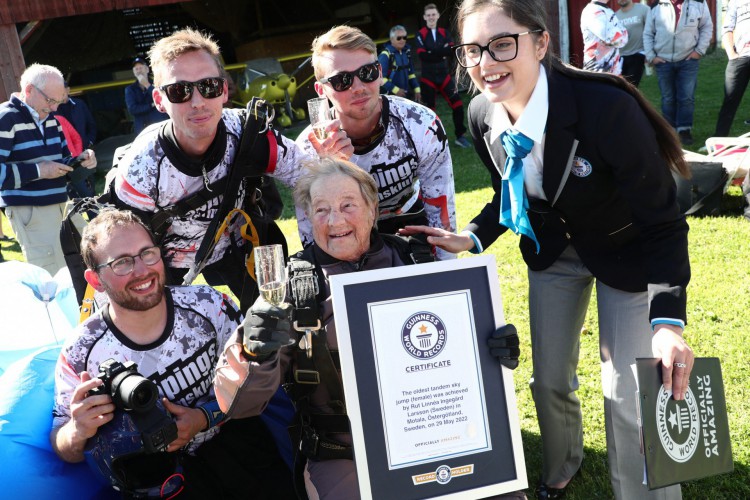 Rut Larsson, uma sueca de 103 anos, estabeleceu novo recorde mundial ao se tornar a pessoa de maior idade a realizar um salto duplo de paraquedas. A idosa saltou de um aeródromo em Motala, perto de Estocolmo, capital da Suécia, no último domingo, 29.