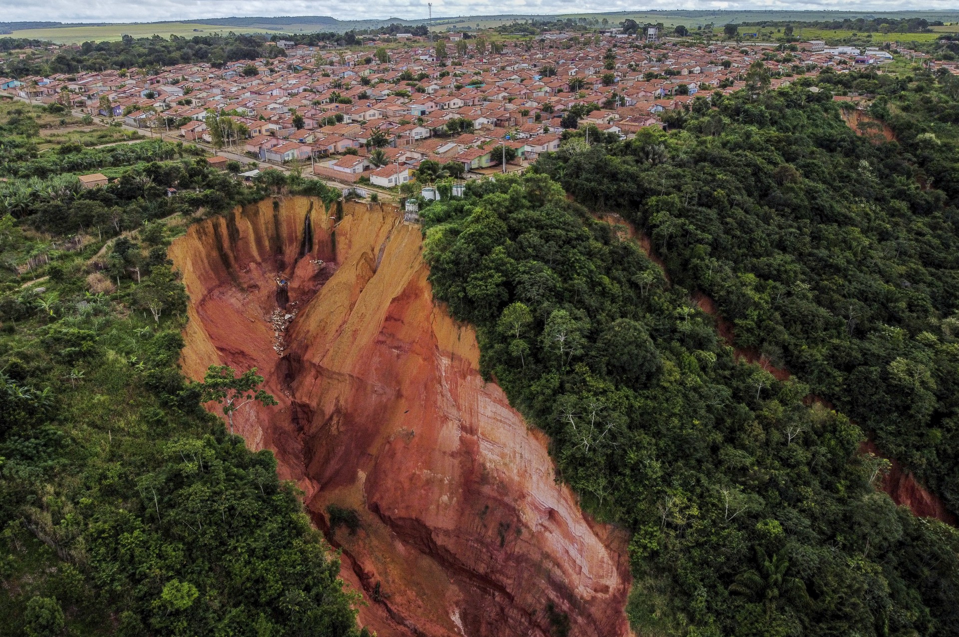 Na borda de um abismo de mais de 60 metros, Maria dos Santos, de 45 anos, lamenta o avanço de uma das maiores voçorocas da cidade. "Aqui não tinha buraco, começou há pouco tempo, menos de três anos", diz Maria, de pele morena e cabelos cacheados, de pé sobre o asfalto rachado em uma curva na parte derrubada pelo desfiladeiro.