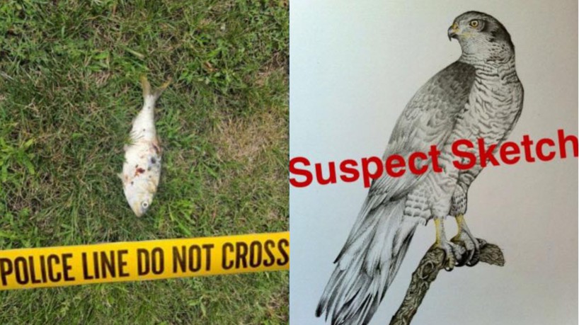 Batizado como “Gillian”, o peixe aparece como vítima do caso e uma faixa amarela escrito “Limite policial, não ultrapasse”. Além disso, foi feito um “retrato falado” do “suspeito do crime”, a ave.
