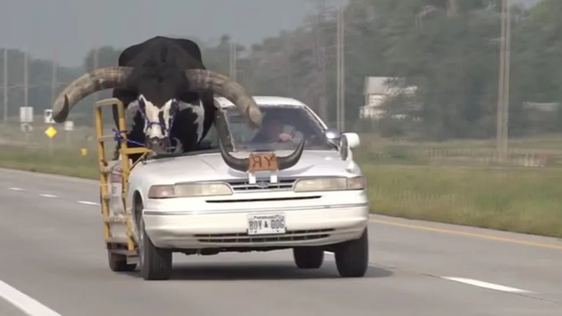 Veja vídeo de um touro gigante sendo transportado no banco de passageiros, nos EUA