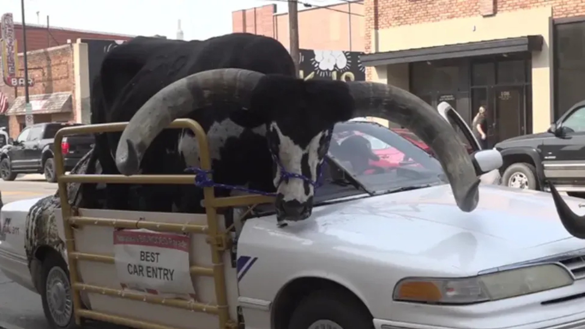 O automóvel foi adaptado pelo motorista para que o touro gigante pudesse ser transportado. O teto que fica do lado do passageiro foi removido, uma grade de proteção foi colocada do lado de fora para conseguir amarrar o animal.