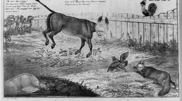 O político de Tennessee era considerado por seus oponentes como um “jackass” (“burro” ou “imbecil” em tradução livre) e uma litografia de 1833 o representa como um burro, enquanto outra, de 1837, o vê montado no animal, prestes a batê-lo.