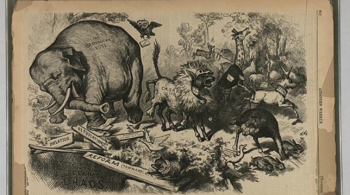 O elefante dos Republicanos também foi conceitualizado nas charges da época e aparece na edição de 1874 da Harper’s Magazine como mais um trabalho de Thomas Nast, um contratado da revista. A peça foi intitulada “The Third Term Panic”.
