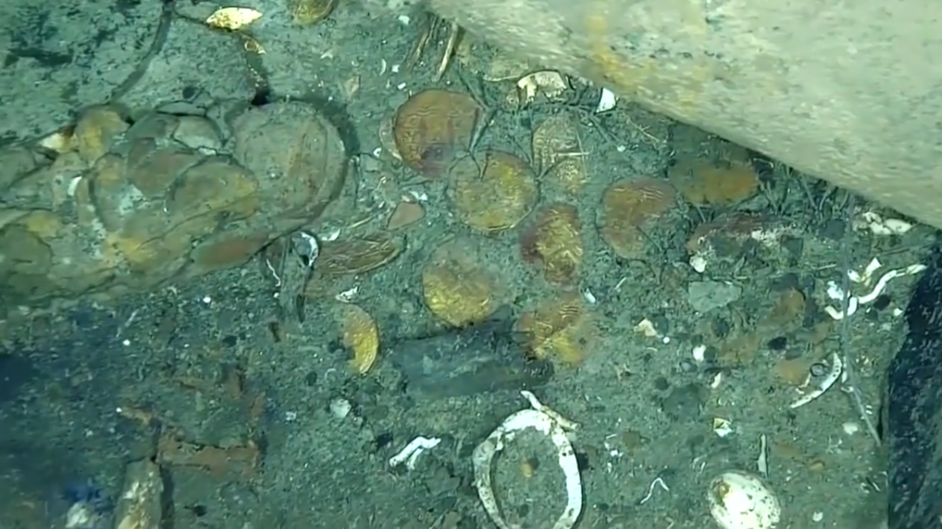 Milhares de moedas douradas dividem espaço com destroços e restos de esqueletos no campo de escombros do San José na costa da Colômbia.