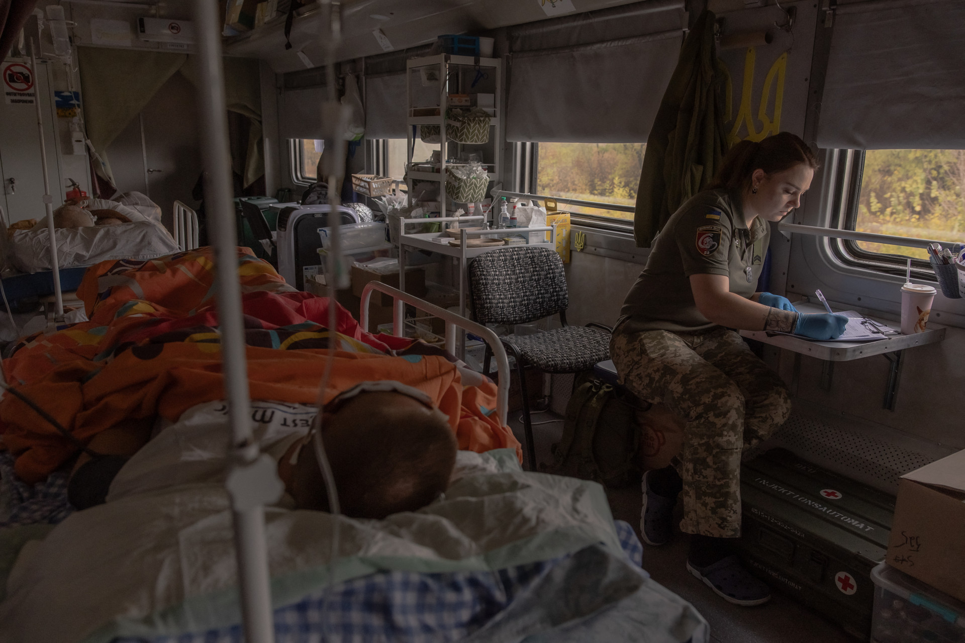 Parece um trem comum esperando para sair de uma estação comum, mas através de suas janelas embaçadas é possível ver um soldado ucraniano com ferimentos no rosto, deitado em uma maca. Os demais vagões azuis e amarelos deste trem do Exército transportam soldados feridos para hospitais longe da precária região de fronteira.