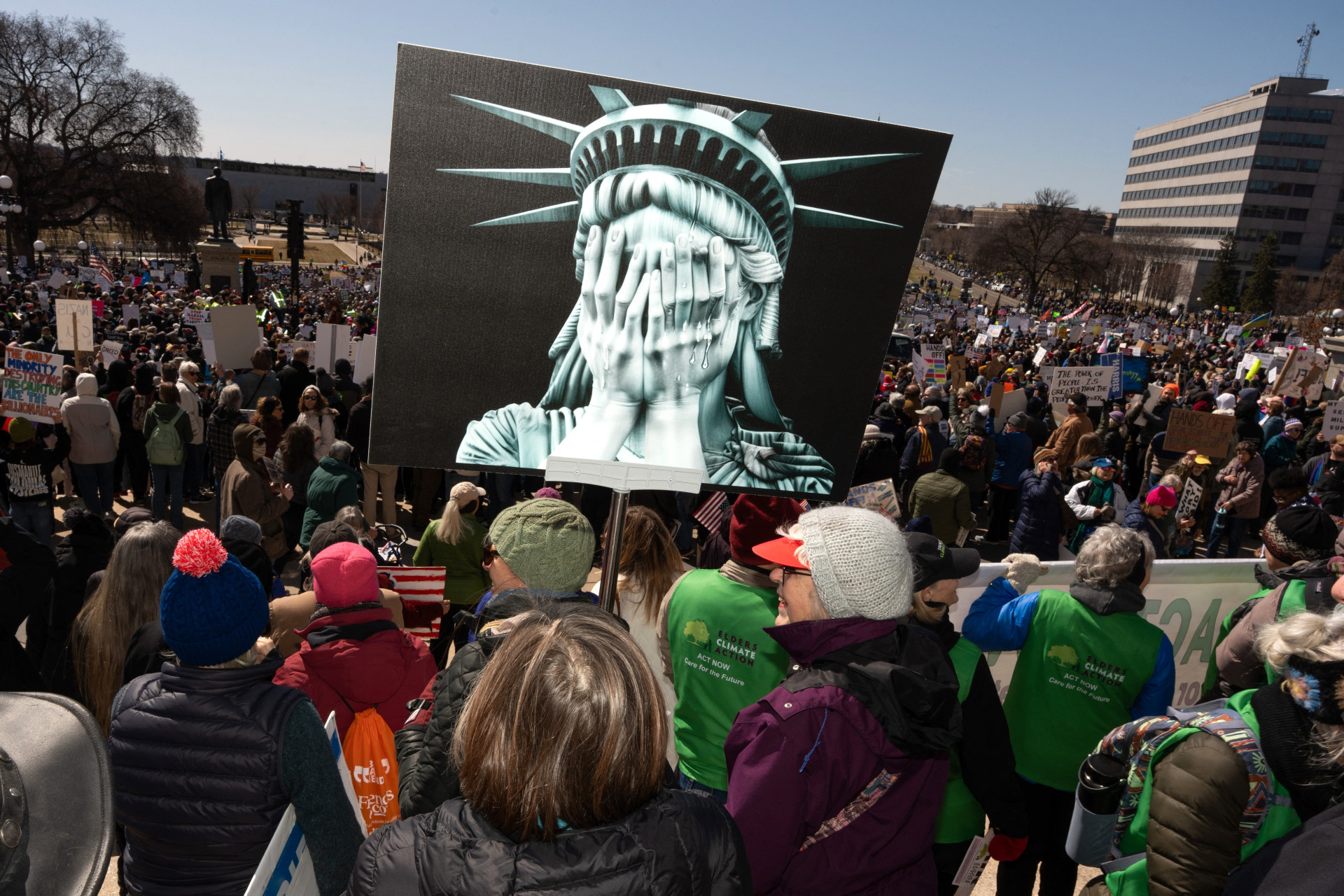 Os manifestantes atacaram as medidas do governo Trump como as demissões de milhares de funcionários federais, fechamentos de escritórios de campo da Administração da Previdência Social e agências inteiras, deportações de imigrantes, reduções das proteções para pessoas transgênero e cortes no financiamento federal para programas de saúde .
