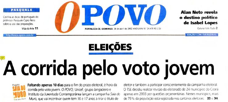 Iniciativa é parceria entre Unicef, O POVO, Ministério Público do Trabalho (MPT-CE), Tribunal Regional Eleitoral (TRE-CE) e Associação para o Desenvolvimento dos Municípios do Ceará (APDM-CE)[FOTO1]Assumir lugar de fala nunca foi decisão tão presente. Para o Fundo das Nações Unidas para a Infância (Unicef), a participação de adolescentes em consultas e debates públicos não deve mais ser vislumbrada como futuro, e sim parte da política do Brasil presente. Pensando nisso, a instituição lançou nesta terça-feira, 14, o projeto Saia do Muro, espaço para inclusão de novos votantes no debate eleitoral.