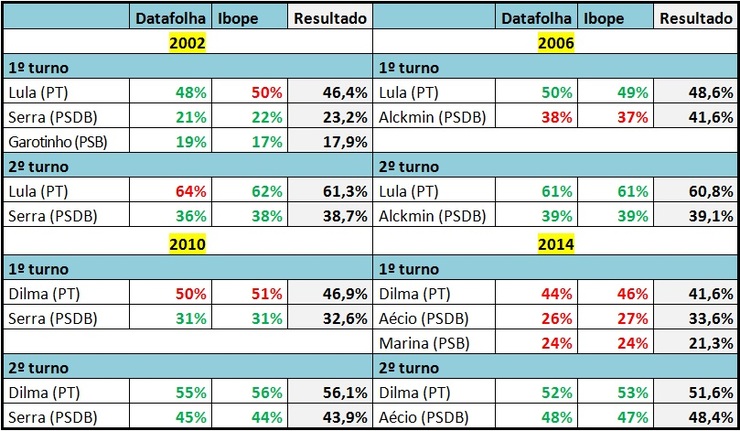Em 2006, Luiz Inácio Lula da Silva (PT) teve números dentro da margem de erro, mas Geraldo Alckmin (PSDB) teve votação maior do que apontavam os institutos. Já em 2002, os números do Datafolha estiverem todos dentro da margem de erro no primeiro turno, mas o percentual de Lula no segundo turno estava acima do que se revelou nas urnas. Já o Ibope, naquela eleição, acertou o resultado do segundo turno, mas, no primeiro turno, deu percentual acima do que Lula teve.