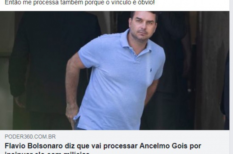 Ciro publicou notícia do portal Poder360 com o título: "Flávio Bolsonaro diz que vai processar Ancelmo Gois por insinuar elo com milícias". O ex-ministro comenta: "Então me processa também porque o vínculo é óbvio!"