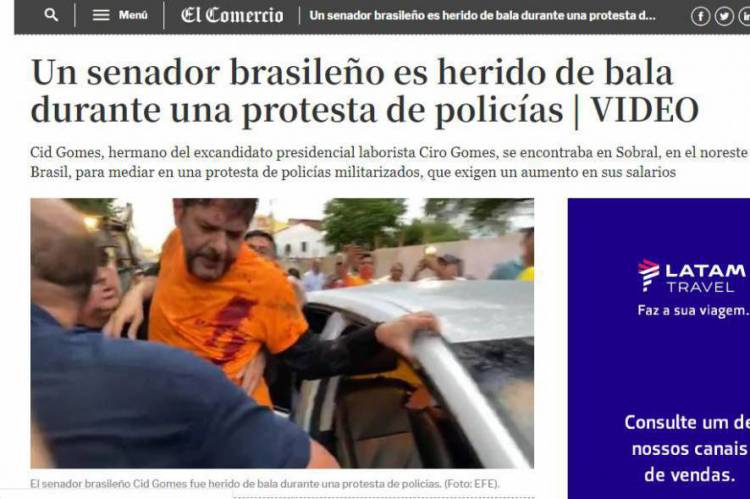 "Brazilian Senator Shot Amid Tumult of Striking Police Force", estampam as manchetes. Em tradução, "Senador brasileiro baleado em meio a tumulto de policiais grevistas"