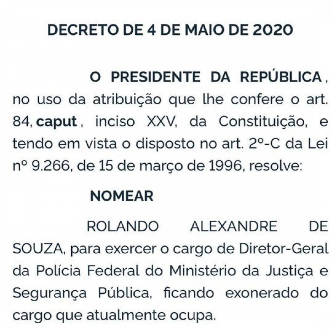 O presidente Jair Bolsonaro indicou Rolando Alexandre de Souza para assumir o cargo de diretor-geral da Polícia Federal (PF). Atualização saiu na manhã desta segunda, 4, em decreto assinado pelo presidente e pelo ministro da Justiça e Segurança Pública, André Mendonça. Indicação apareceu em edição extra do Diário Oficial da União (DOU).