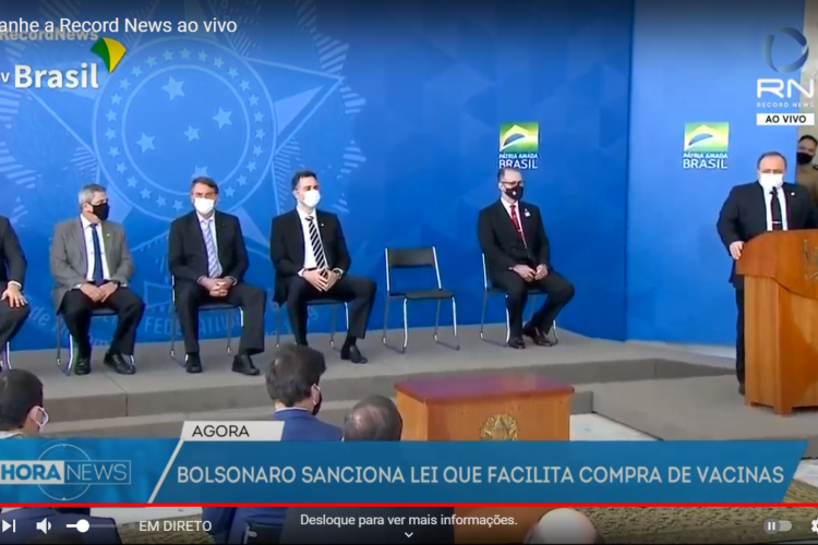 O presidente Jair Bolsonaro (sem partido) e o ministro da Saúde, Eduardo Pazuello, apareceram de máscaras nessa quarta-feira, 10, para sanção de lei que facilita a compra de vacinas. Na condução da pandemia, o mandatário levantou suspeição quanto à eficácia dos imunizantes e criticou até mesmo o uso de máscaras de proteção.