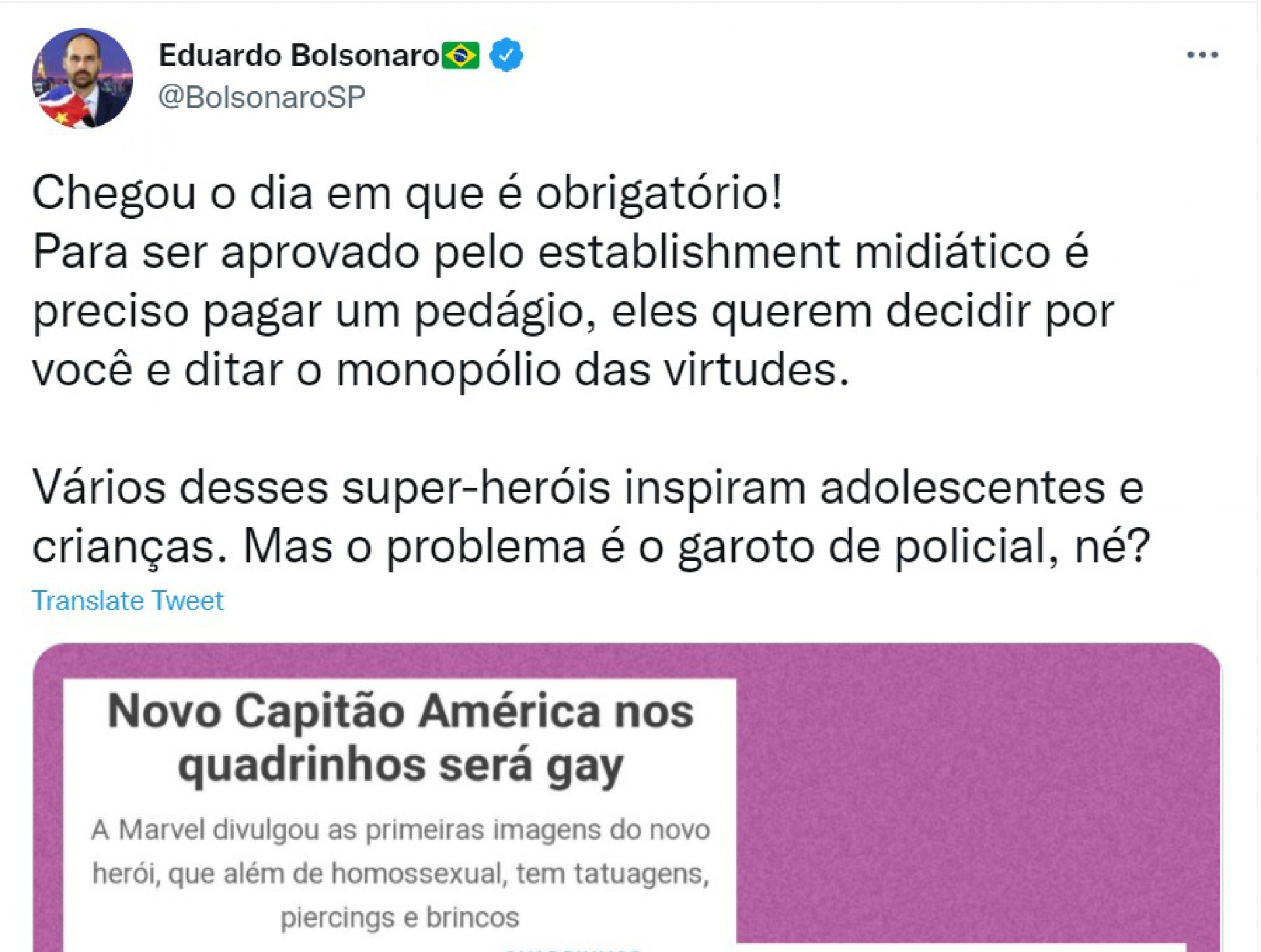“A intenção não é democratizar os super-heróis ou tornar o mundo + tolerante, é o contrário: destruir a masculinidade dos mais tolerantes p dominar estes cordeiros e instigar o ódio nos resistentes para poder acusá-los de homofóbicos e depois a esquerda se dizer protetora dos gays”, escreveu.
