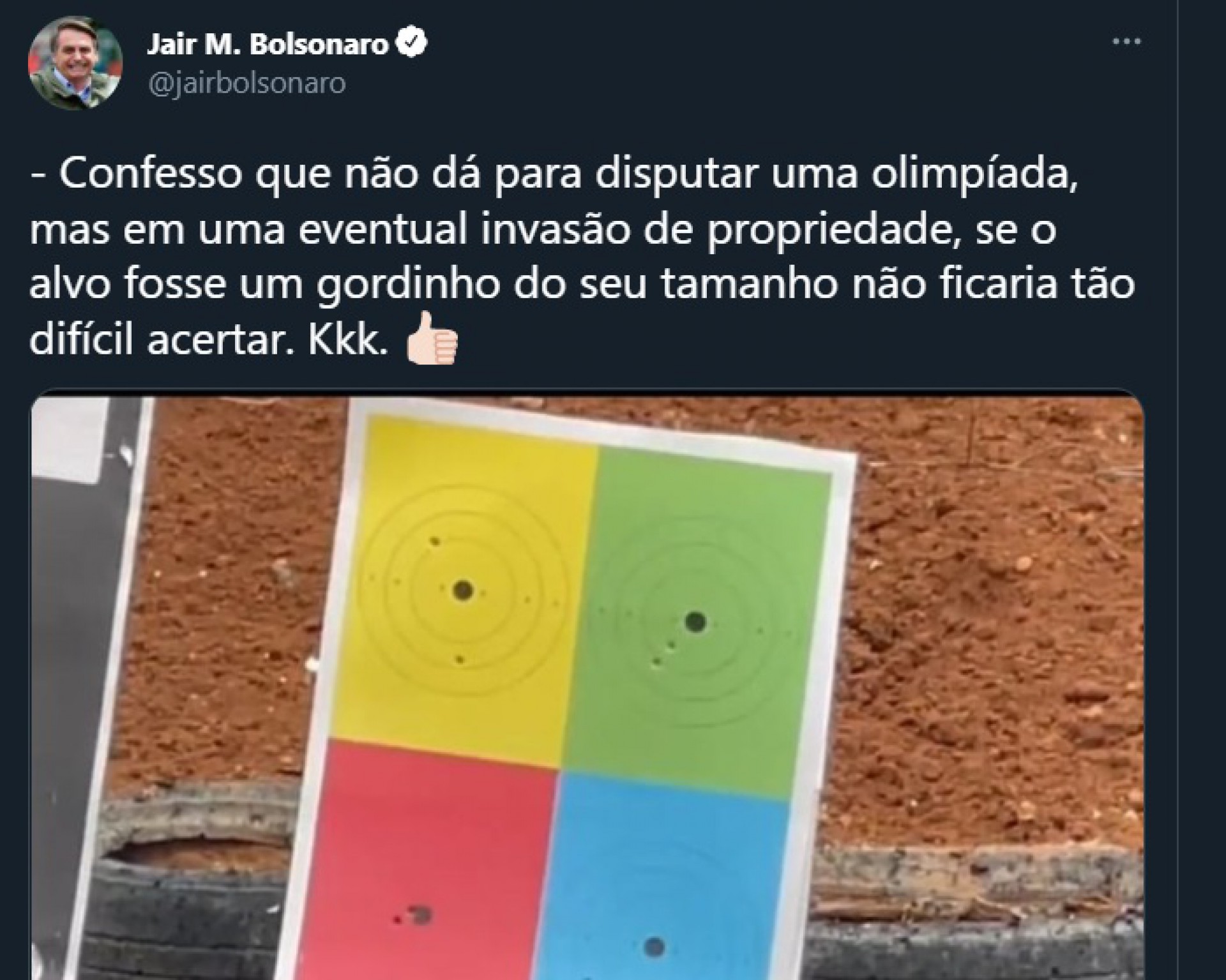 O presidente Jair Bolsonaro (PL) escreveu no Twitter nesta segunda-feira, 7, que não seria difícil acertar um alvo "gordinho" como o youtuber Cauê Moura, em resposta a um vídeo publicado pelo influenciador, que mostra Bolsonaro com dificuldades de manusear uma arma.