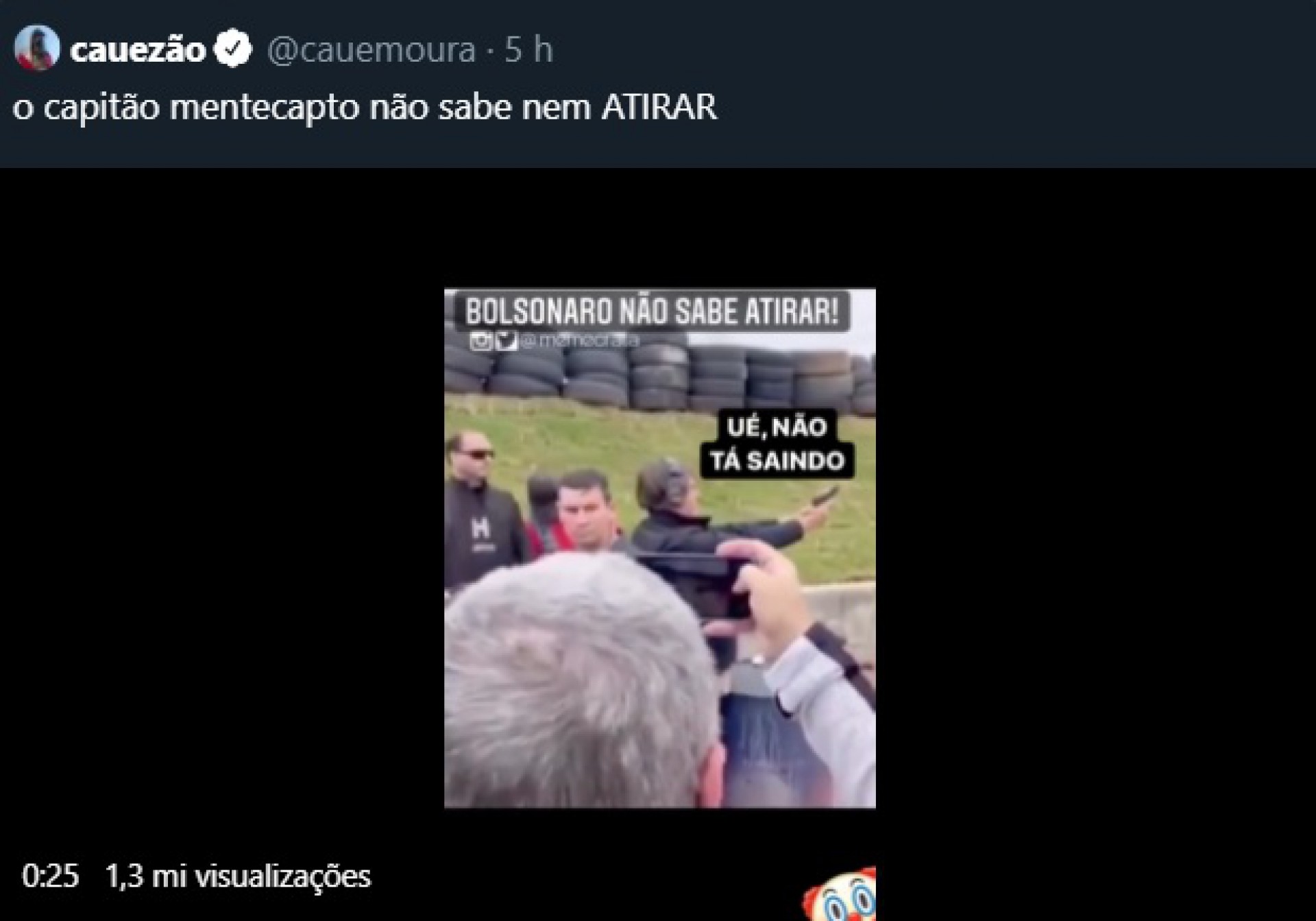 O vídeo divulgado pelo youtuber exibe o presidente acompanhado do filho, o vereador Carlos Bolsonaro (Republicanos-RJ), e um instrutor, em visita feita a um clube de tiro no domingo. "O capitão mentecapto não sabe nem atirar", escreveu Moura, no tuíte publicado.