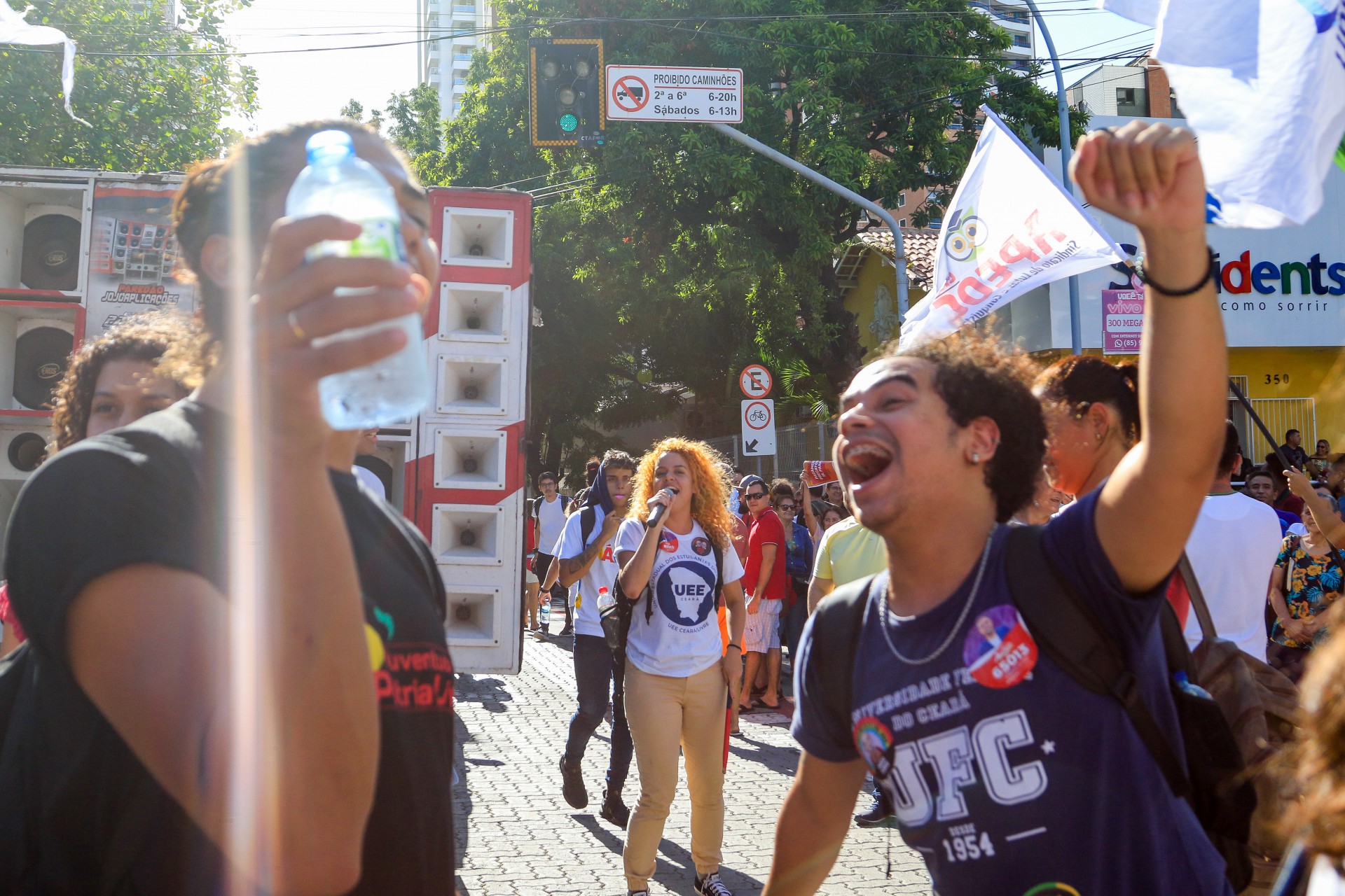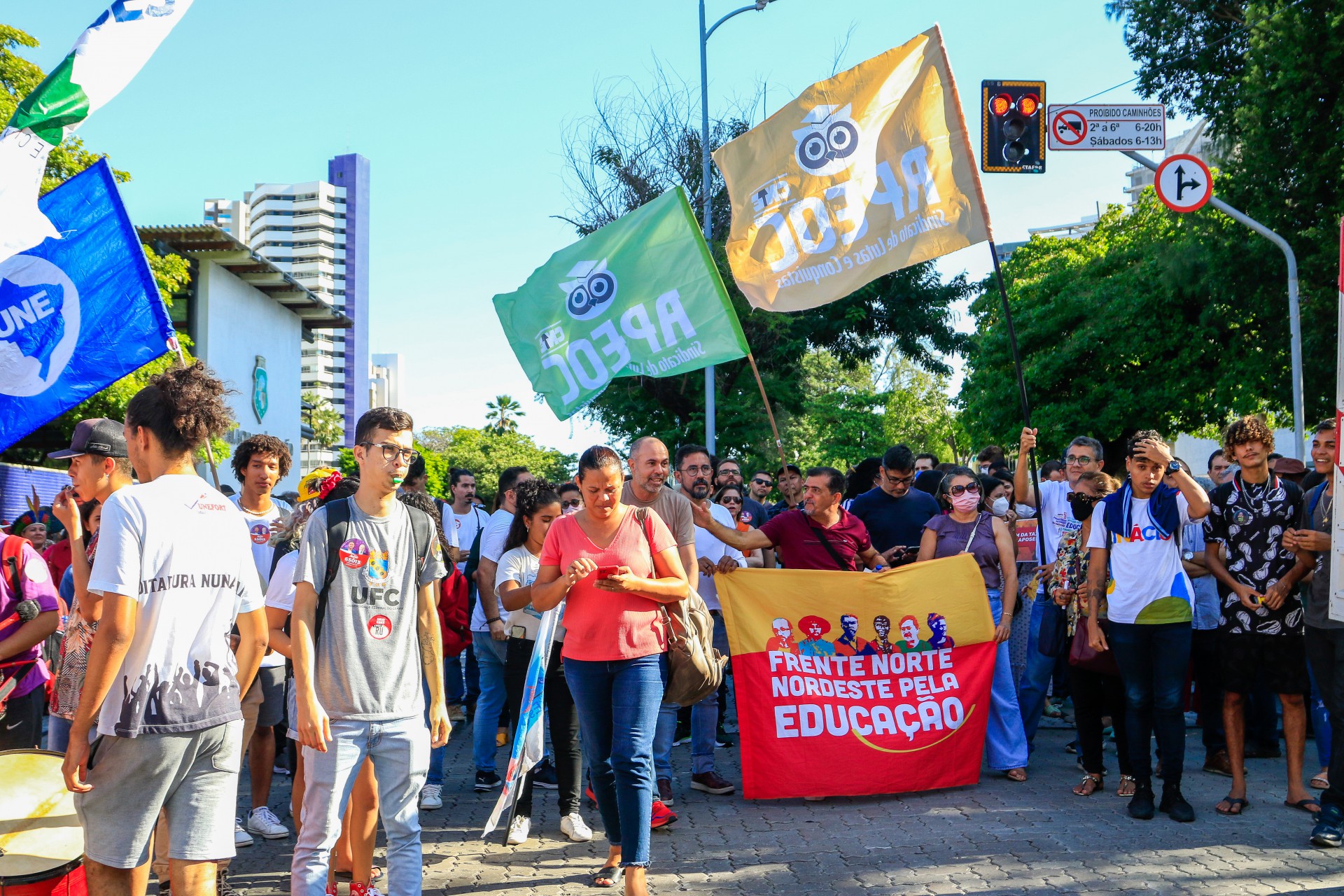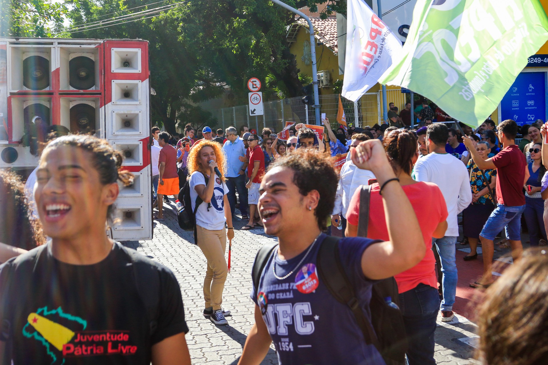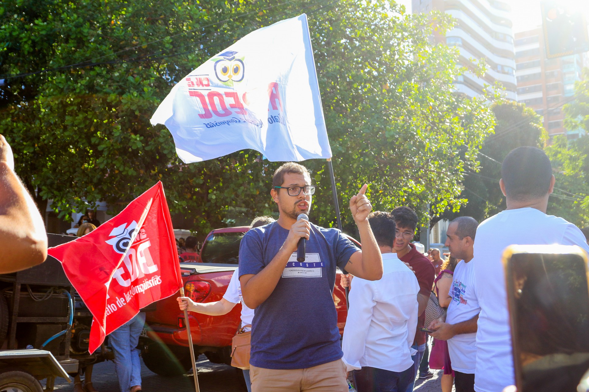 O Sindicato dos Professores e Servidores da Educação Estadual do Ceará (Apeoc) realizou protesto na tarde desta segunda-feira, 5, em frente ao Palácio da Abolição, sede do Governo do Ceará, em Fortaleza. Estiveram juntos professores, alunos e outros movimentos sindicais para reivindicarem - entre outras pautas -, o pagamento de 60% dos recursos do Fundo de Manutenção e Desenvolvimento do Ensino Fundamental e Valorização do Magistério (Fundef). Caso não tenham as questões atendidas nos próximos 15 dias, a categoria promete convocar assembleia geral para discutir possibilidade de entrar em greve.