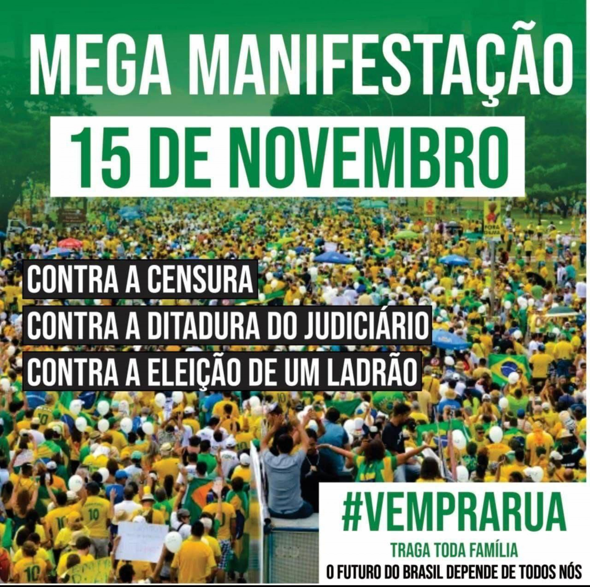 "Infiltrados podem ter no dia 15 com a intenção de invadir, criar um tumulto. Cabe a quem tiver no ato, ficar de olho para impedir quem queira fazer uma coisa dessas", disse um dos apoiadores nas redes sociais. Segundo eles, as ações violentas podem acontecer contra prédios governamentais da Praça dos Três Poderes: Supremo Tribunal Federal (STF), Congresso Nacional e Palácio do Planalto.
