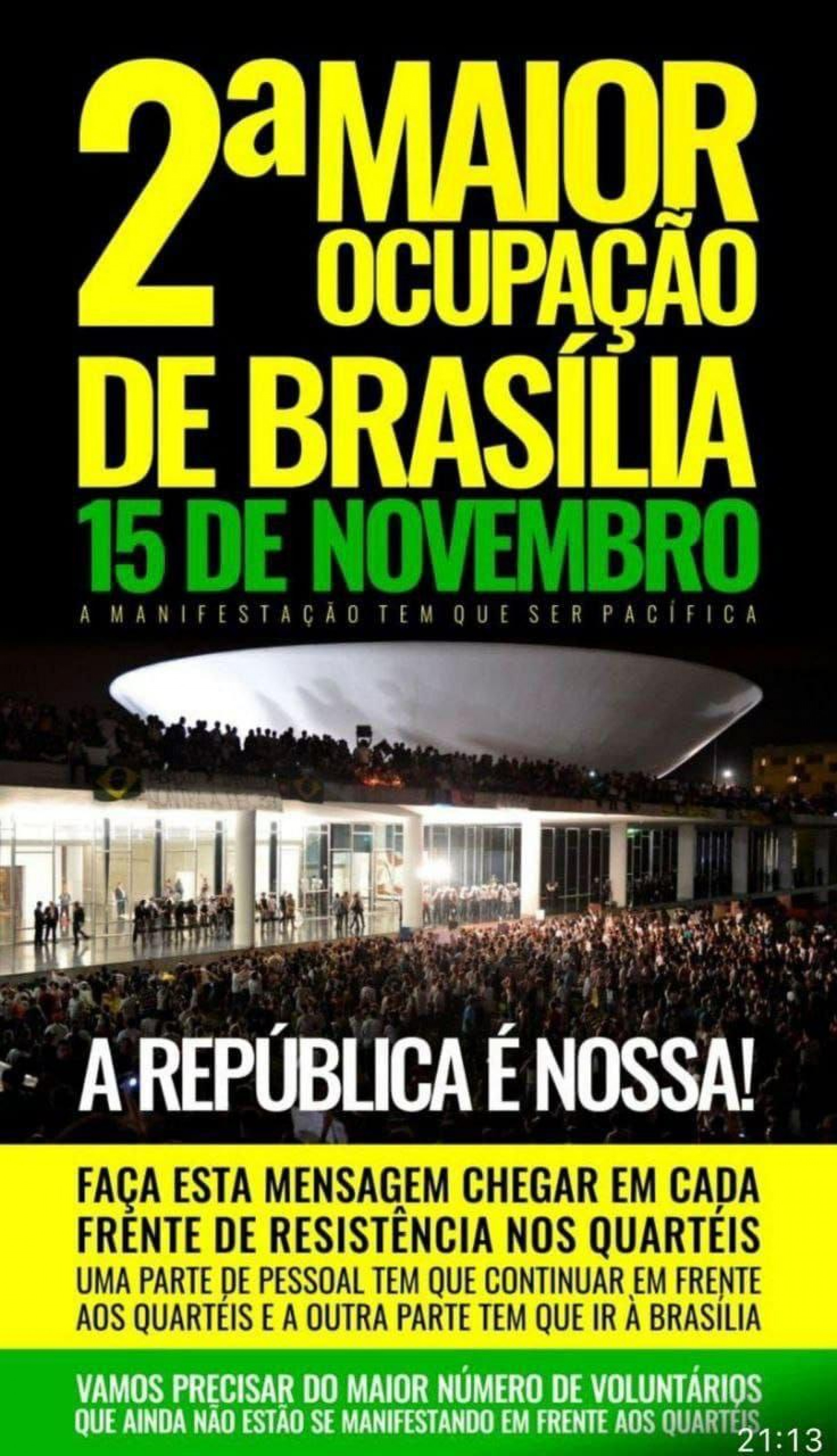 Para os apoiadores que não foram a Brasília, é solicitado a presença em frente aos prédios militares de diversas cidades