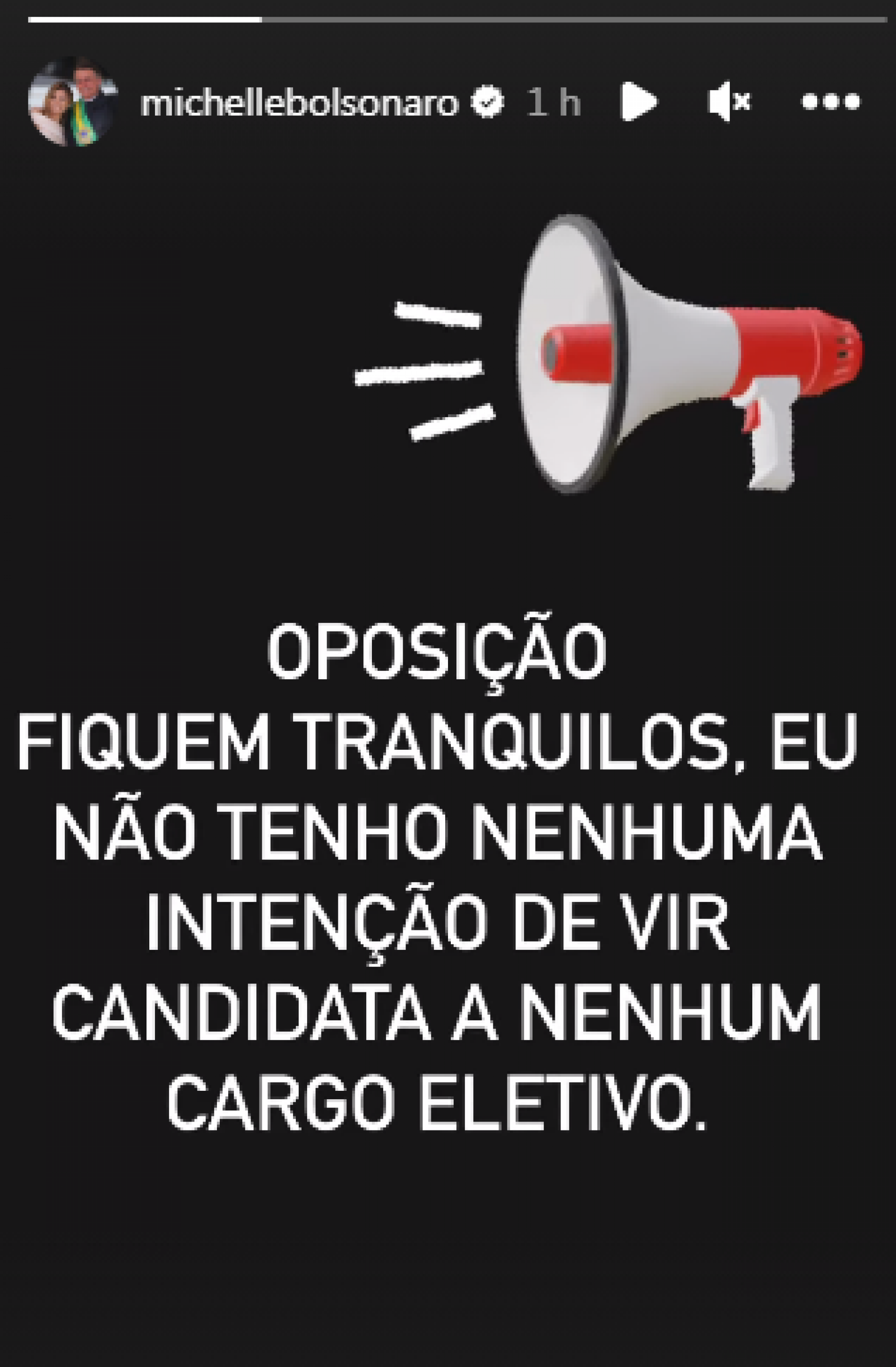"Oposição, fiquem tranquilos, eu não tenho nenhuma intenção de vir candidata a nenhum cargo eletivo", afirmou Michelle nas redes sociais.