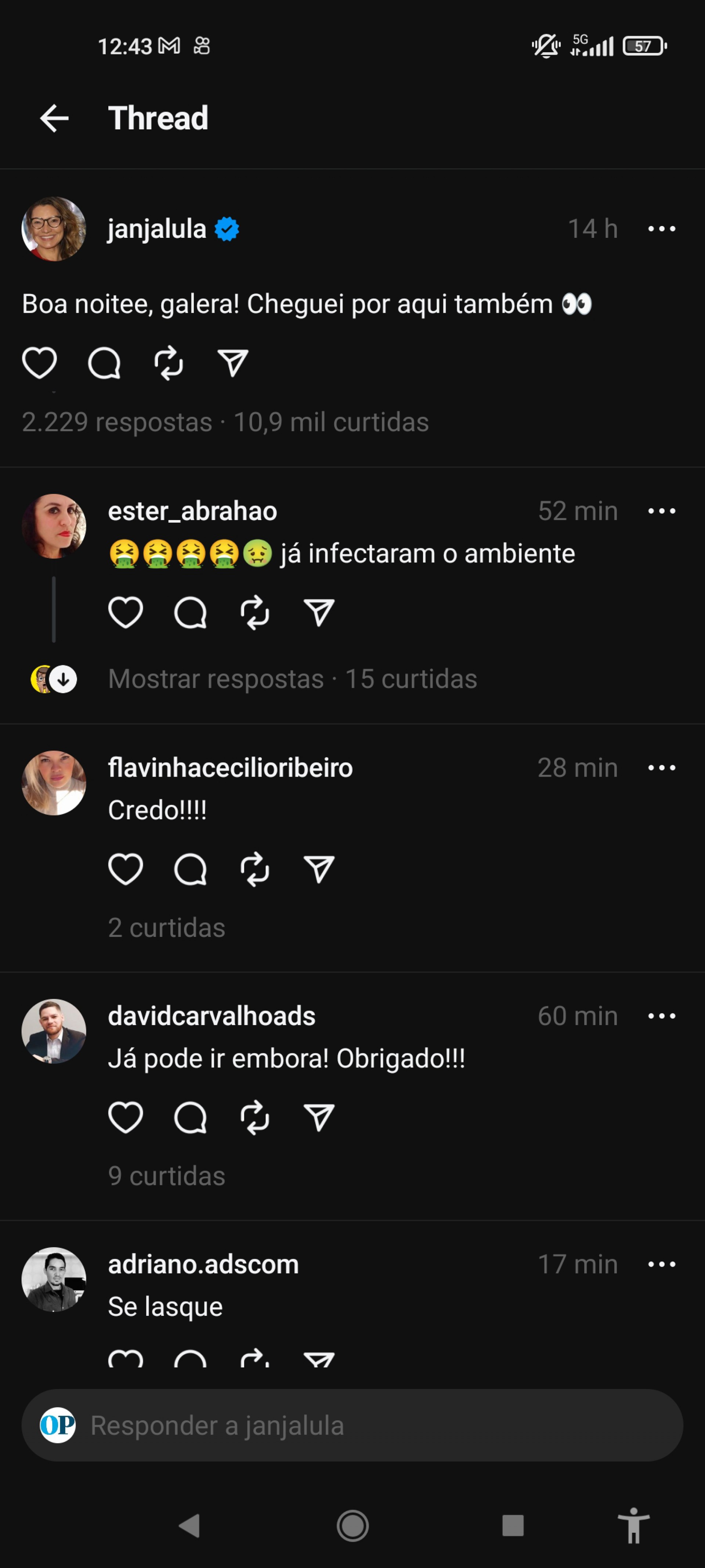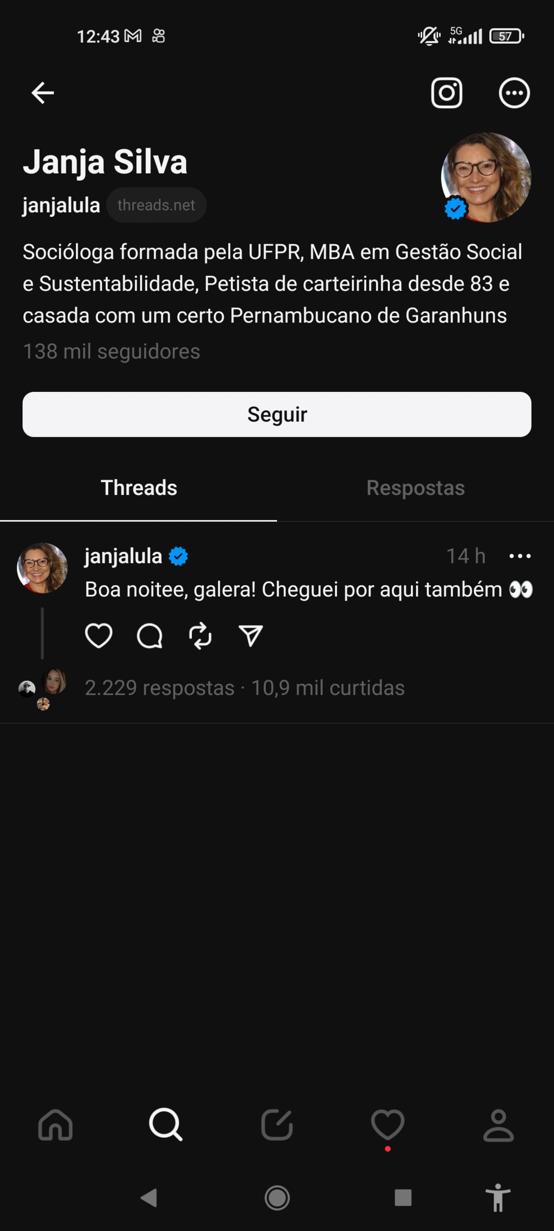 Atuante nas redes sociais, Janja criou uma conta no Threads assim que a plataforma foi liberada para download. Ela tinha 102 mil seguidores até a manhã desta quinta-feira, 6.