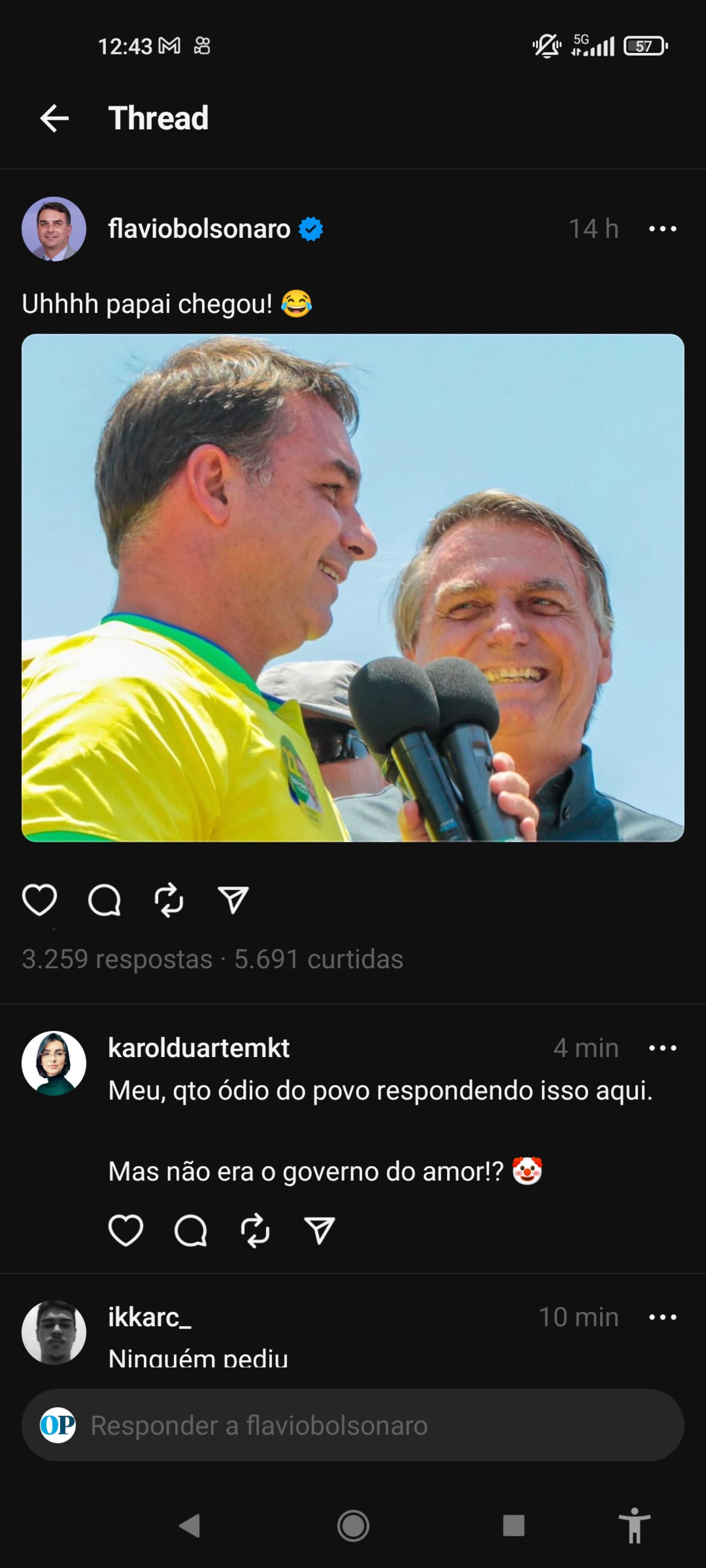 Em sua primeira postagem na rede social, Flávio Bolsonaro compartilhou uma foto dele ao lado do pai, o ex-presidente Jair Bolsonaro (PL) com a legenda: "Uhhh papai chegou!". O senador acumulava 54 mil seguidores até amanhã desta quinta-feira, 6.