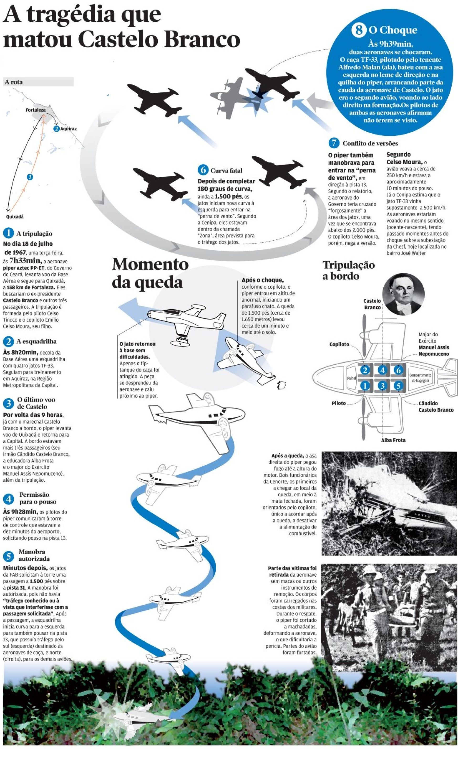 O livro também destaca que, "por omissão absoluta da torre de controle", a esquadrilha de quatro jatos da FAB entrara em rota de colisão com o Piper de Castello Branco. Lira Neto ressalta as últimas palavras do ex-presidente, segundo o relato do copiloto e único sobrevivente do acidente aéreo: "Faça qualquer coisa para nos salvar", teria dito Castello à tripulação enquanto o avião caia num mergulho fatal.