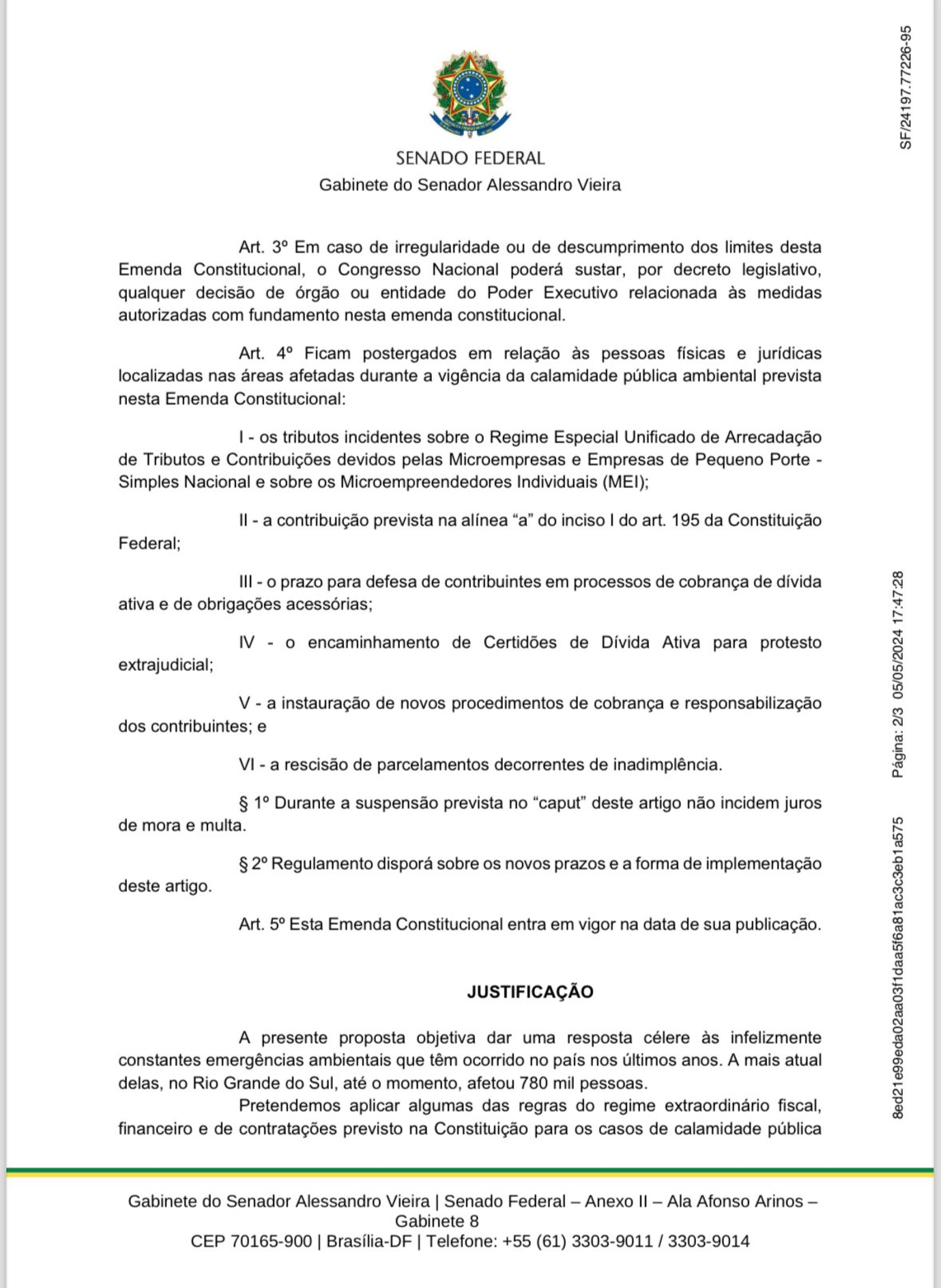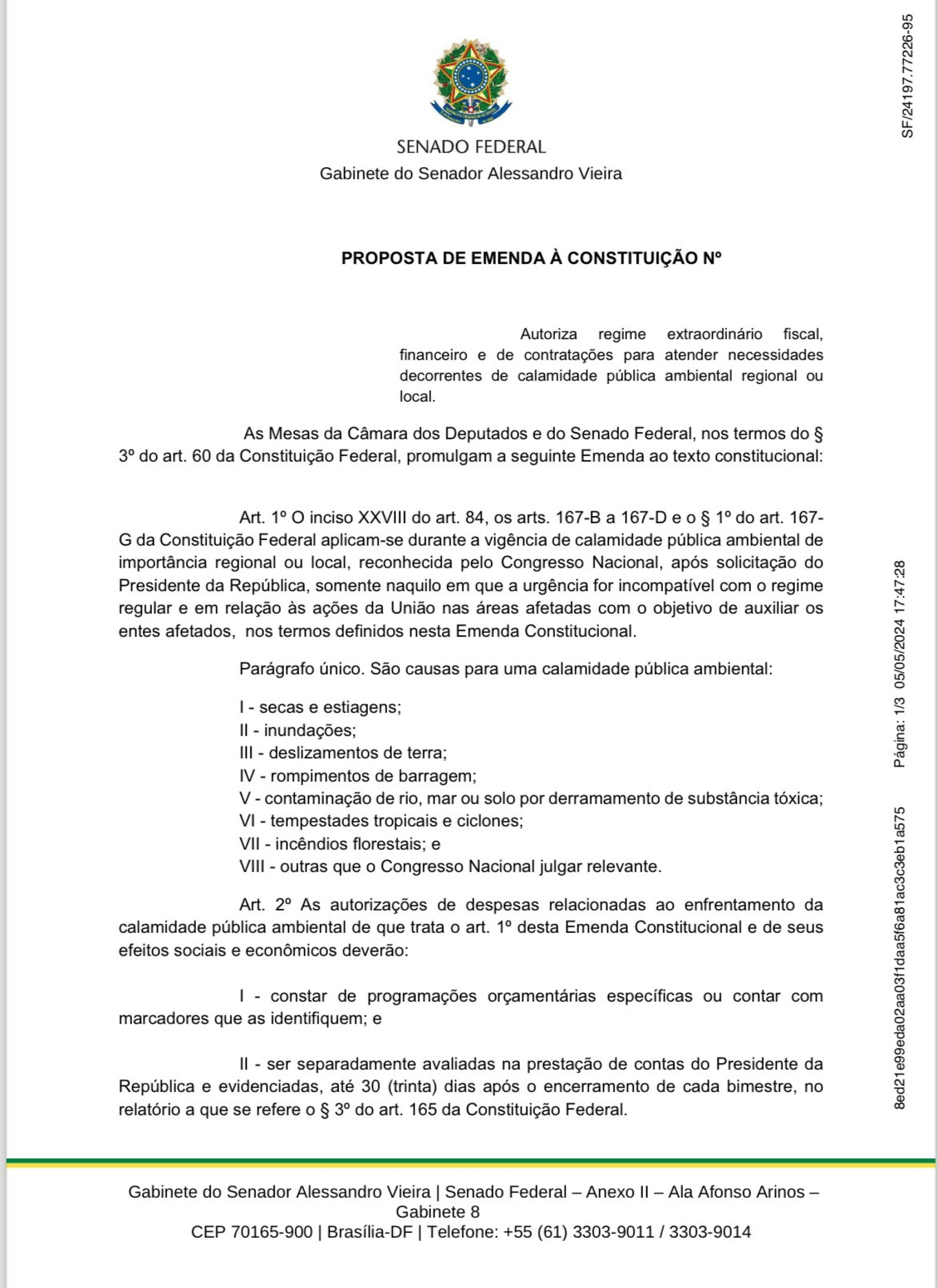 Por meio das redes sociais, o senador Alessandro Vieira justificou a PEC: “É preciso garantir meios para a urgente reconstrução, ao mesmo tempo em que avançamos em mecanismos de prevenção e adaptação.”
