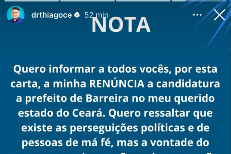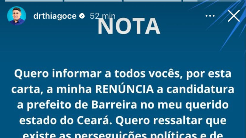 "Quero informar a todos vocês, por esta carta, a minha RENÚNCIA à candidatura a prefeito de Barreira. Quero ressaltar que existem as perseguições políticas e de pessoas de má fé, mas a vontade do povo por mudança não pode parar", diz trecho da nota publicada.