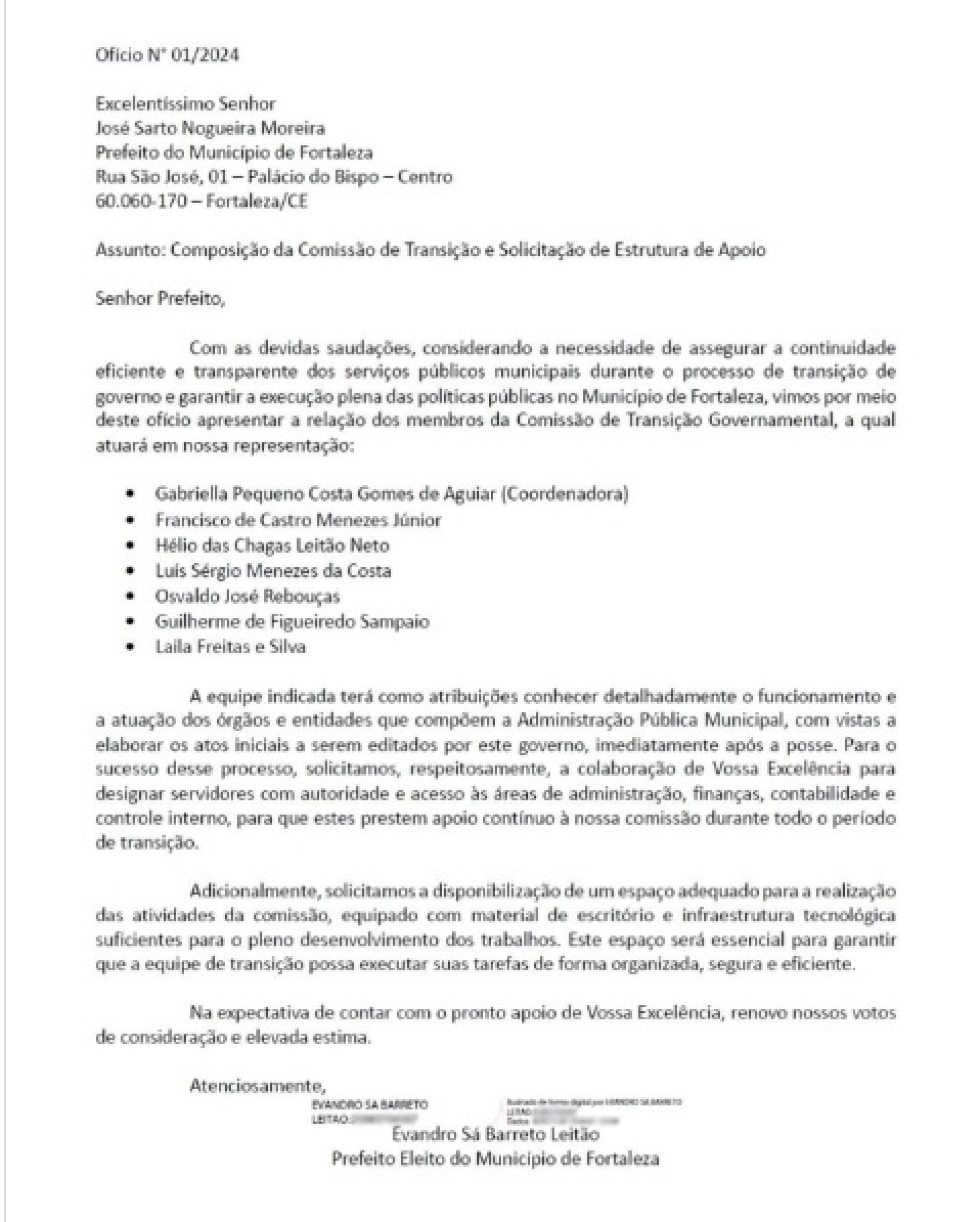 O prefeito eleito informou que o ofício formalizando a equipe foi encaminhado ao prefeito José Sarto (PDT). Na véspera, Sarto havia dito que já tinha definido quem seriam os representantes da atual gestão na transição e aguardava o prefeito eleito enviar os indicados dele para publicaçao do decreto. Na Região Metropolitana de Fortaleza, a transição em Fortaleza era uma das mais atrasadas.