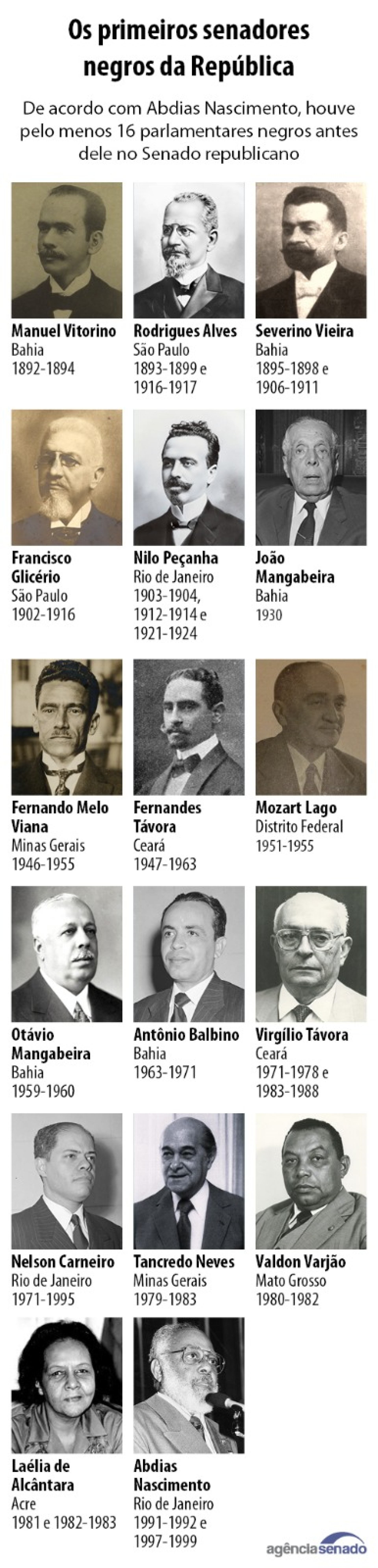 Na República, foram 16 os senadores negros antes de Abdias Nascimento. De acordo com ele, o primeiro foi Manuel Vitorino (BA), que, após deixar o Senado, seria o vice do presidente Prudente de Morais.