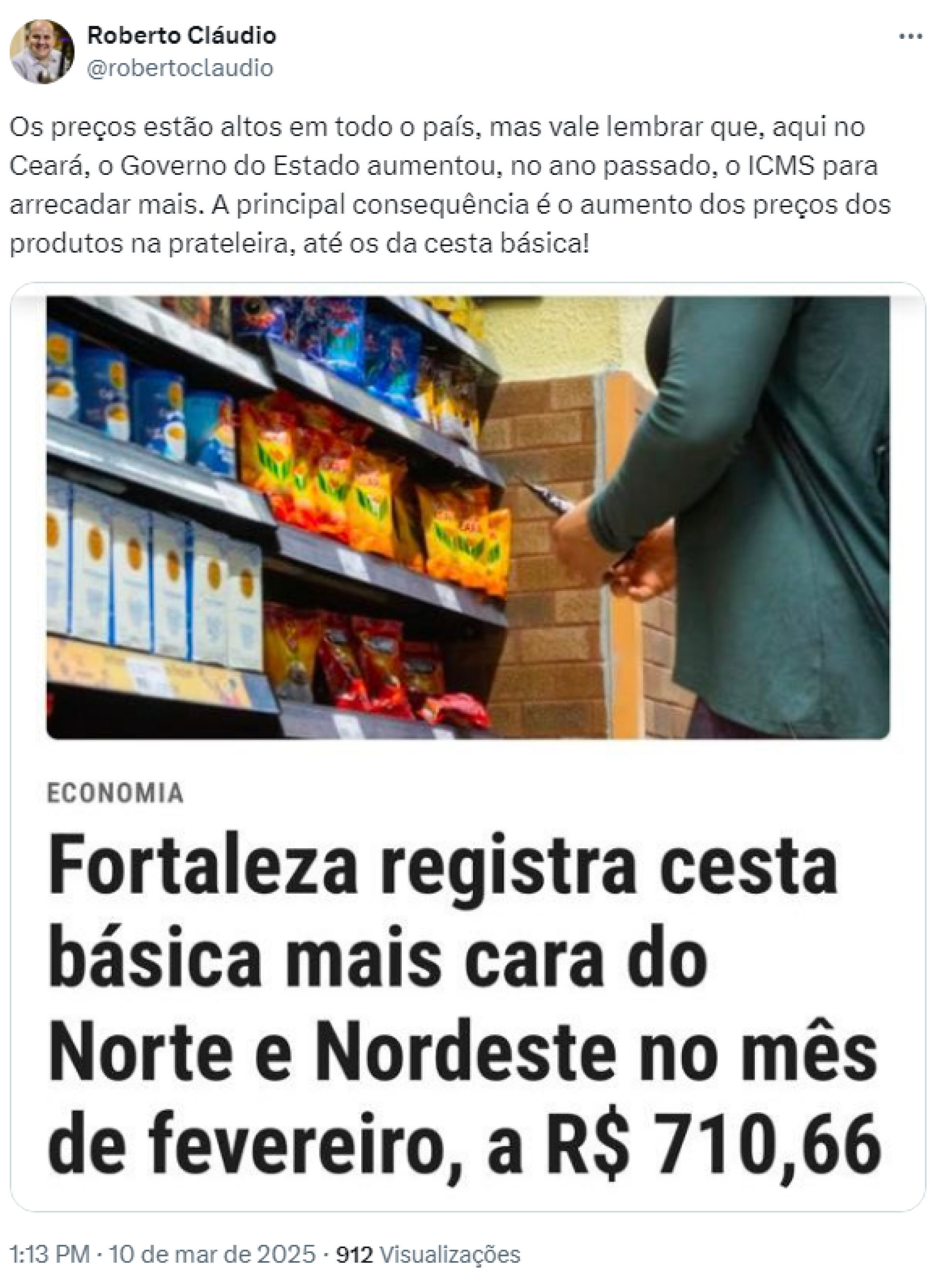 "Os preços estão altos em todo o país, mas vale lembrar que, aqui no Ceará, o Governo aumentou, no ano passado, o ICMS para arrecadar mais. A principal consequência é o aumento dos preços na prateleira, até os da cesta básica! Governo do PT dando demonstração de descaso e insensibilidade com a população mais pobre. A oposição votou contra e disse que isso ia acontecer!", escreveu Roberto.