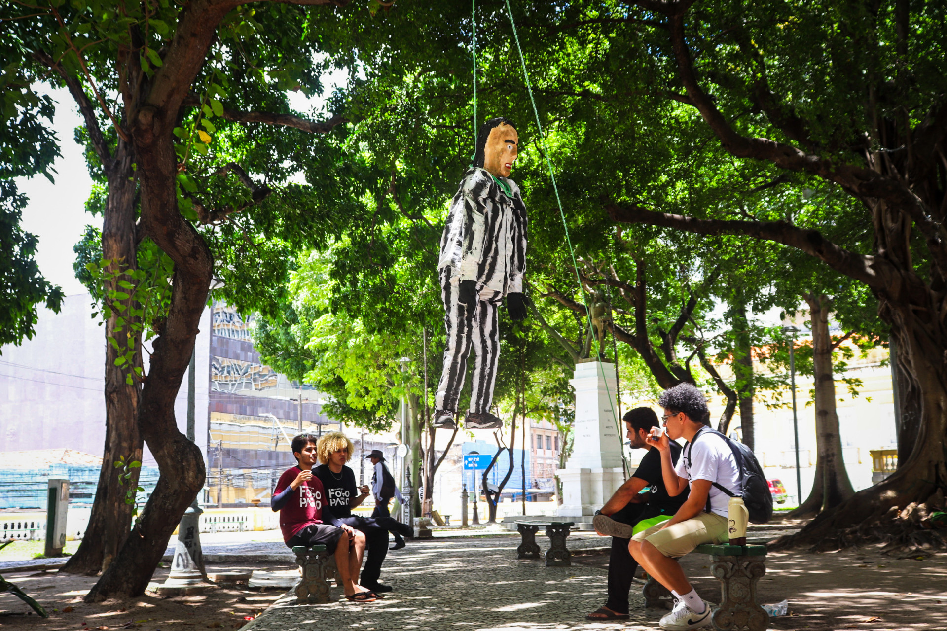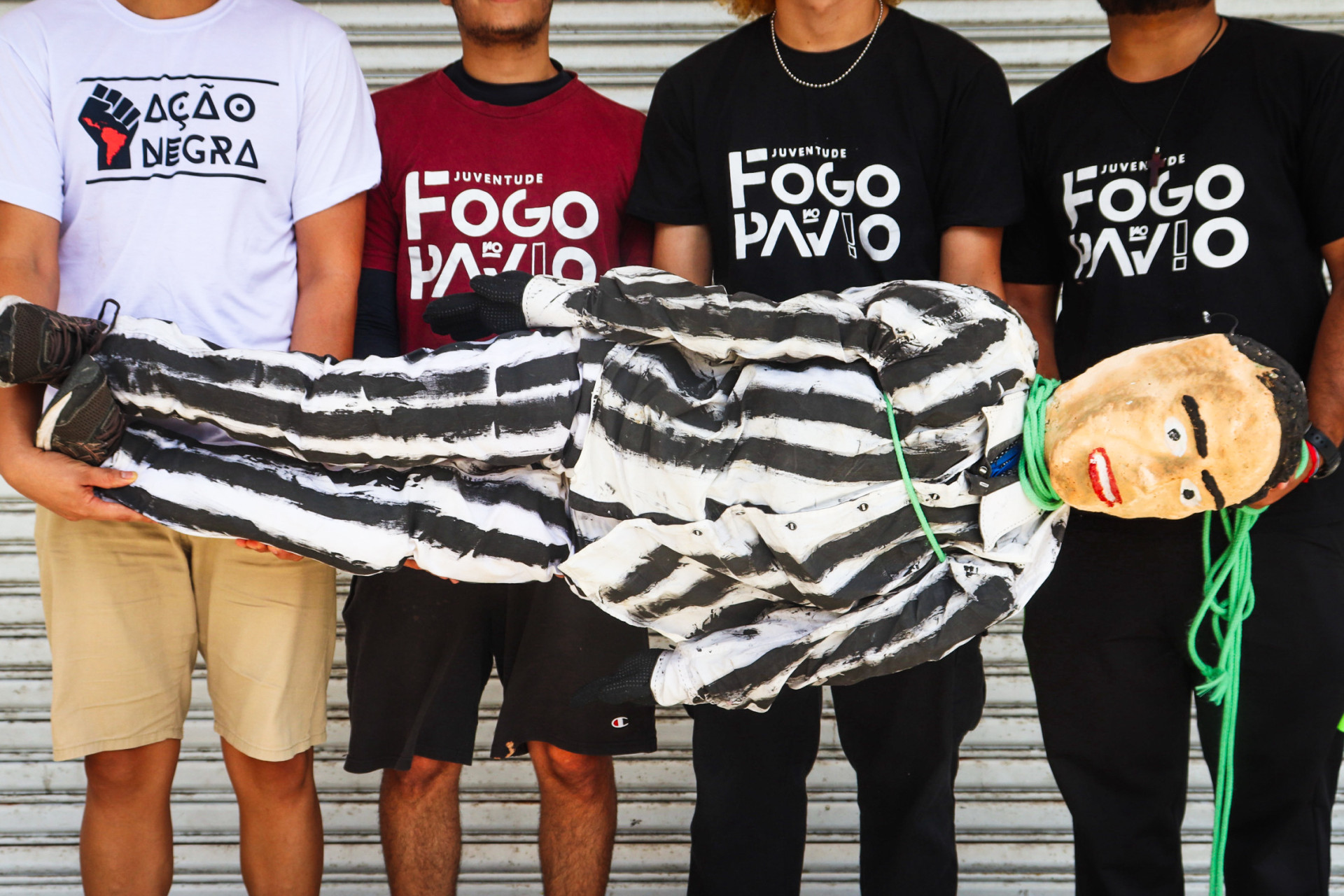 Integrantes de movimento de jovens intitulado Fogo no Pavio e do movimento negro Ação Negra realizaram, na manhã desta terça-feira, 2, em Fortaleza, um ação utilizando um boneco de Judas vestido de presidiário, representando o ex-presidente Jair Bolsonaro (PL), além de faixas exigindo a prisão e repudiando anistia ao ex-presidente.