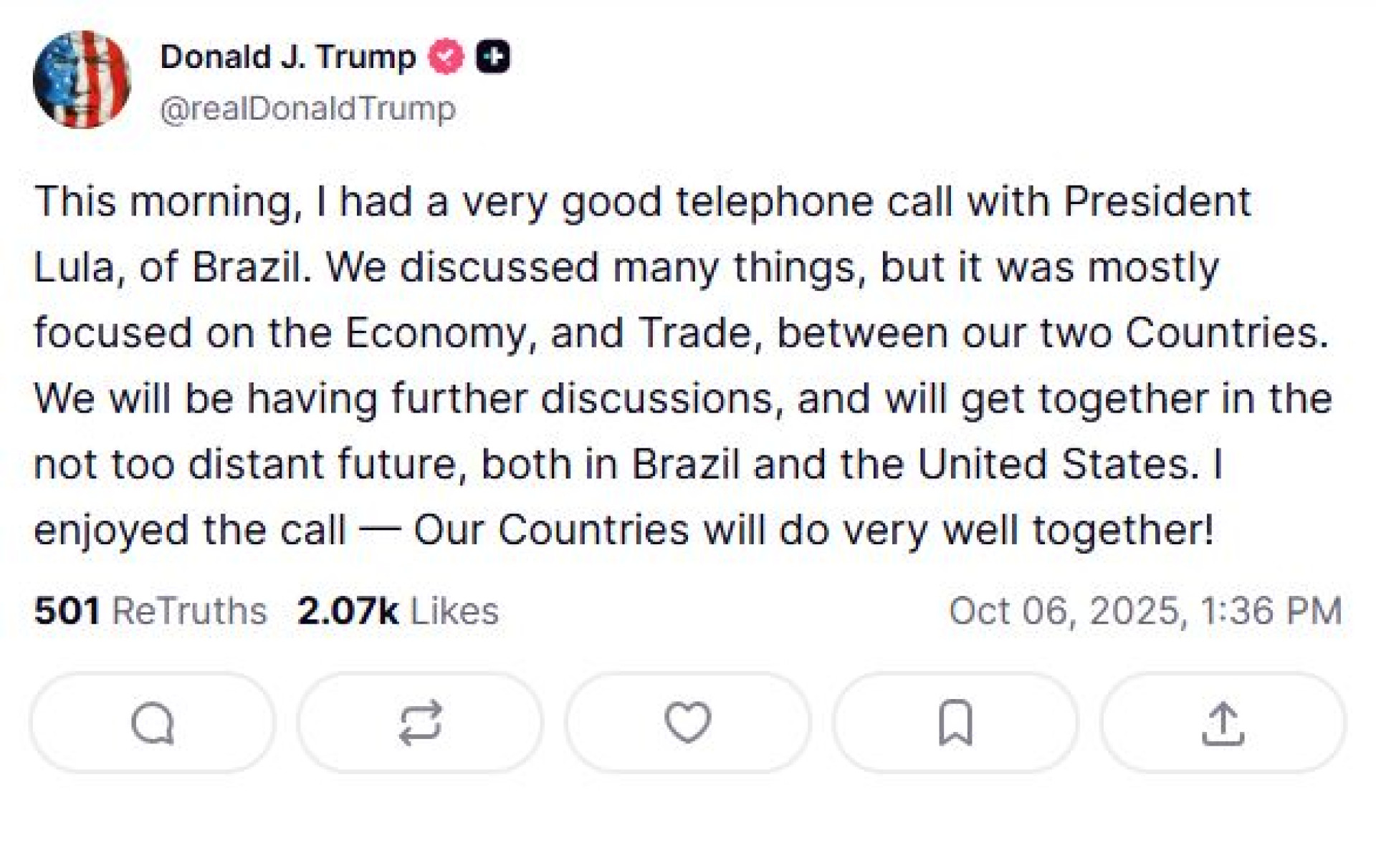 "Esta manhã, tive uma ótima conversa telefônica com o Presidente Lula, do Brasil. Discutimos muitos assuntos, mas o foco principal foi a economia e o comércio entre nossos dois países. Teremos novas discussões e nos encontraremos em um futuro não muito distante, tanto no Brasil quanto nos Estados Unidos. Gostei da conversa — nossos países se darão muito bem juntos!".