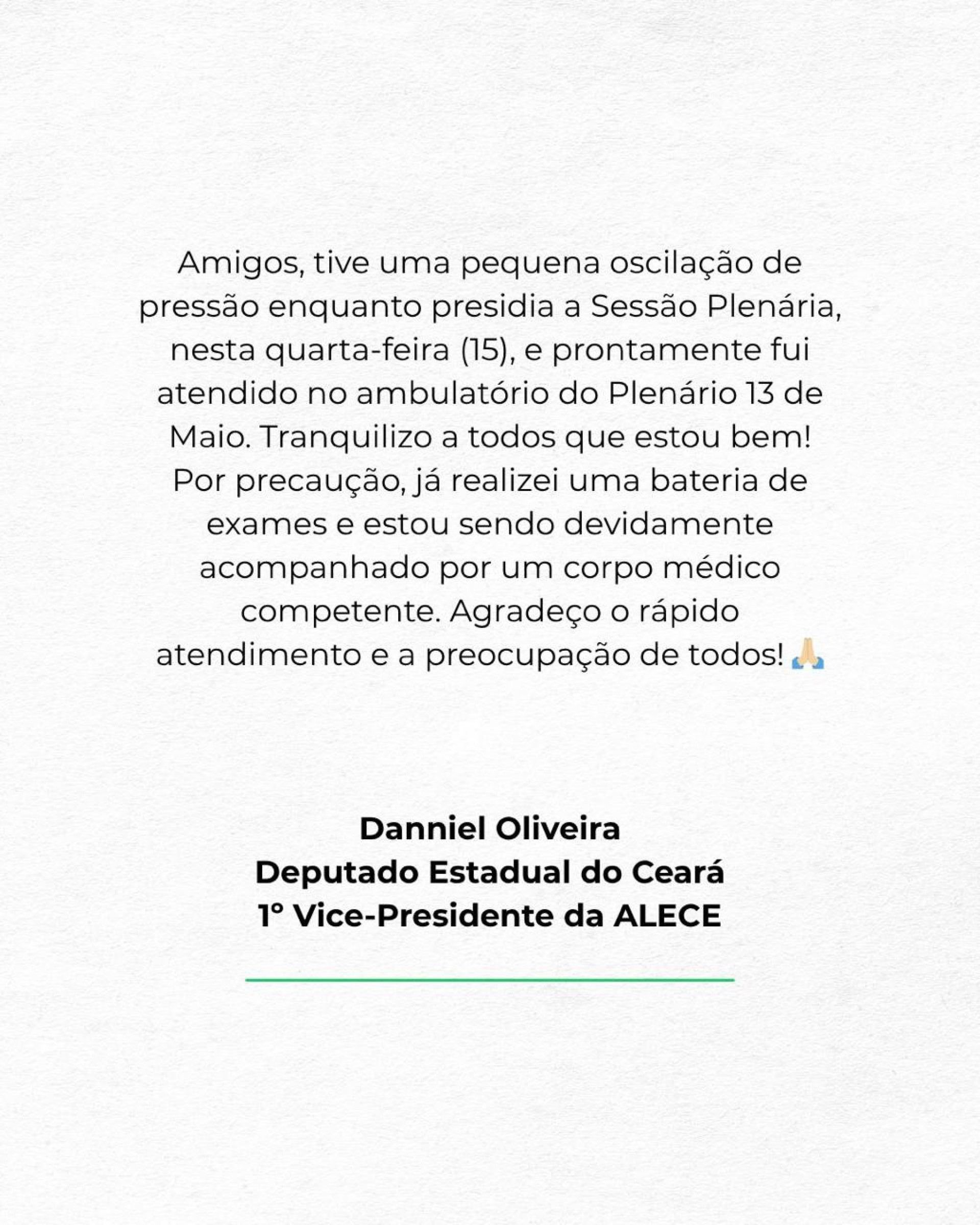 O deputado estadual Danniel Oliveira (MDB) passou mal durante uma sessão plenária da Assembleia Legislativa do Ceará (Alece), na manhã desta quarta-feira, 15. O parlamentar sentiu tonturas enquanto presidia a sessão, na mesa diretora. Ele foi levado pelos colegas Felipe Mota (União Brasil) e Heitor Férrer (União Brasil) para a sala de atendimento da Casa. João Jaime (Progressistas) assumiu a presidência da sessão.