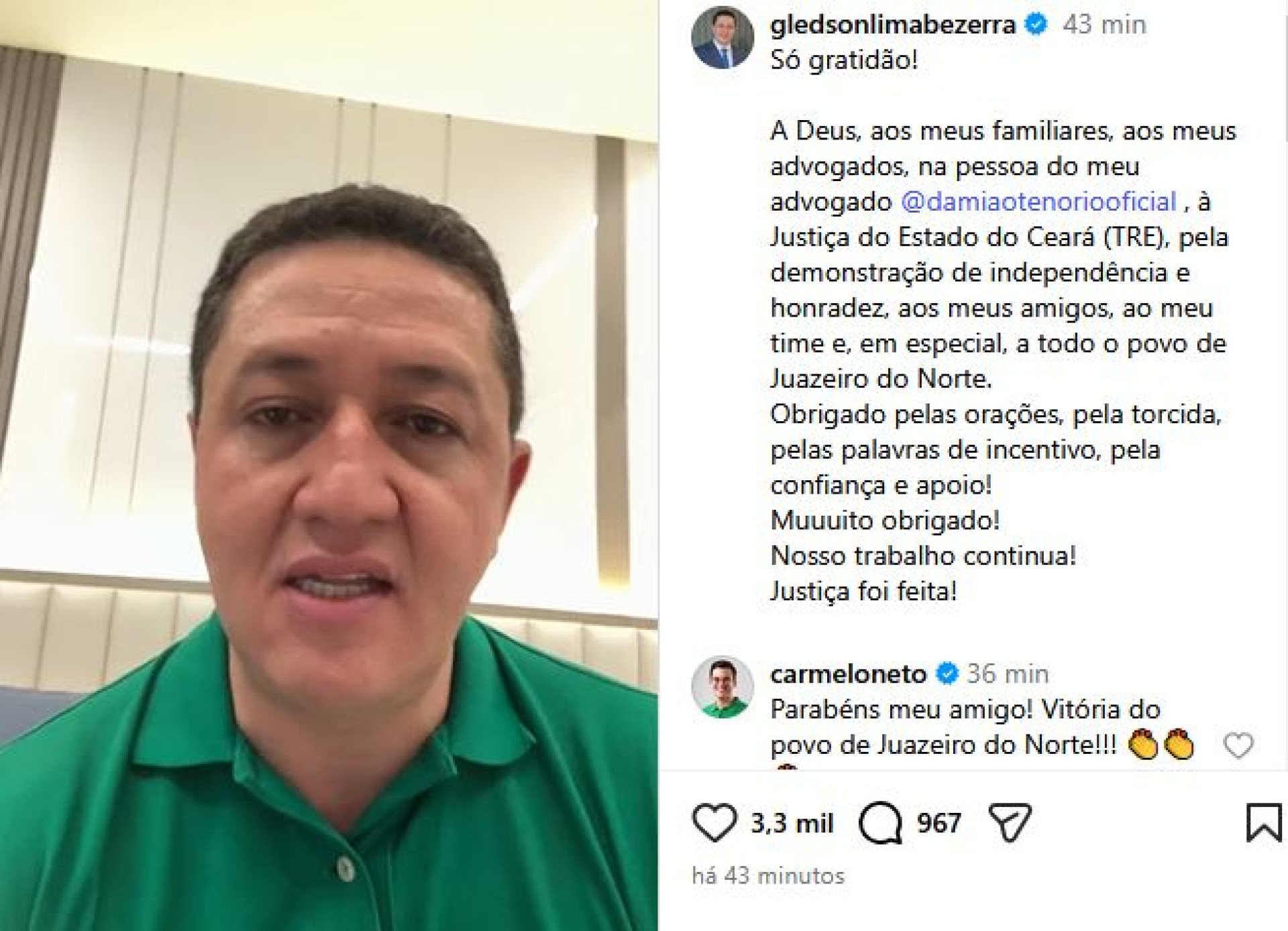Logo após o Tribunal Regional Eleitoral do Ceará (TRE-CE) rejeitar ação que pedia cassação de seu mandato à frente da Prefeitura de Juazeiro do Norte, o prefeito Glêdson Bezerra (Podemos) publicou um vídeo no Instagram agradecendo o apoio que recebeu durante o processo e após o resultado.