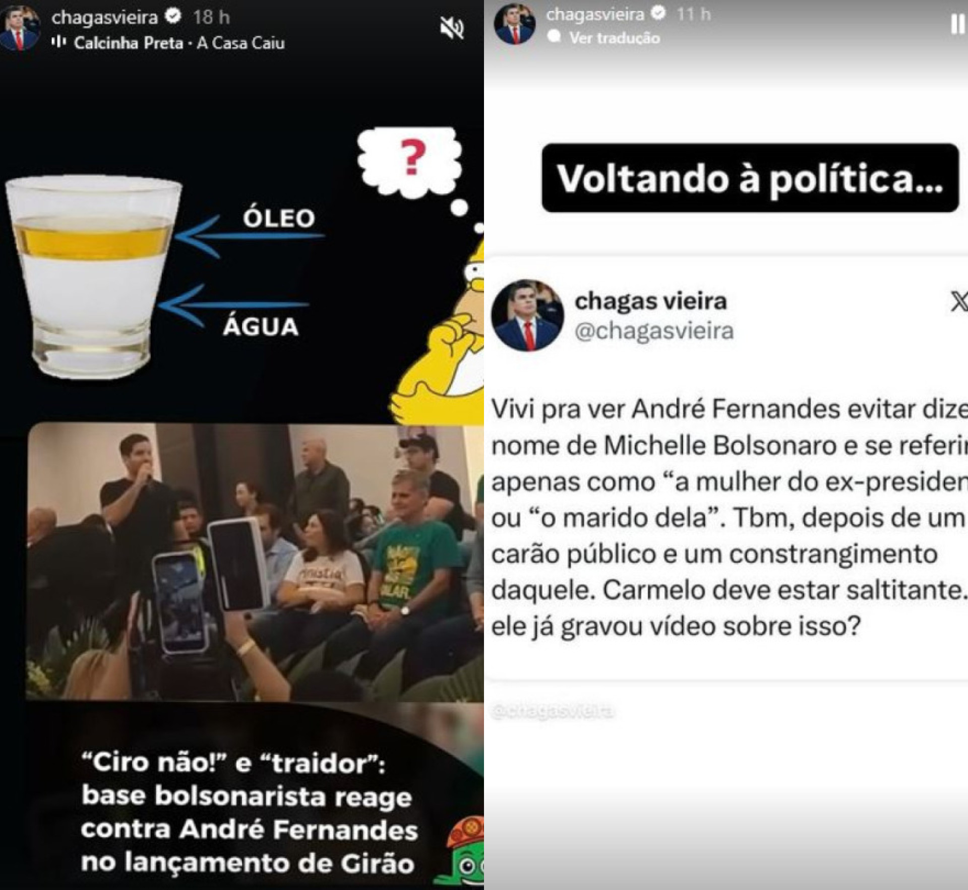 Em outra publicação, Chagas ironiza o fato de Fernandes não citar o nome de Michelle Bolsonaro, referindo-se a ela apenas como "a mulher do ex-presidente". Na sequência, ele ainda ironiza que o deputado estadual Carmelo Neto (PL) deve estar saltitante com o entrevero.