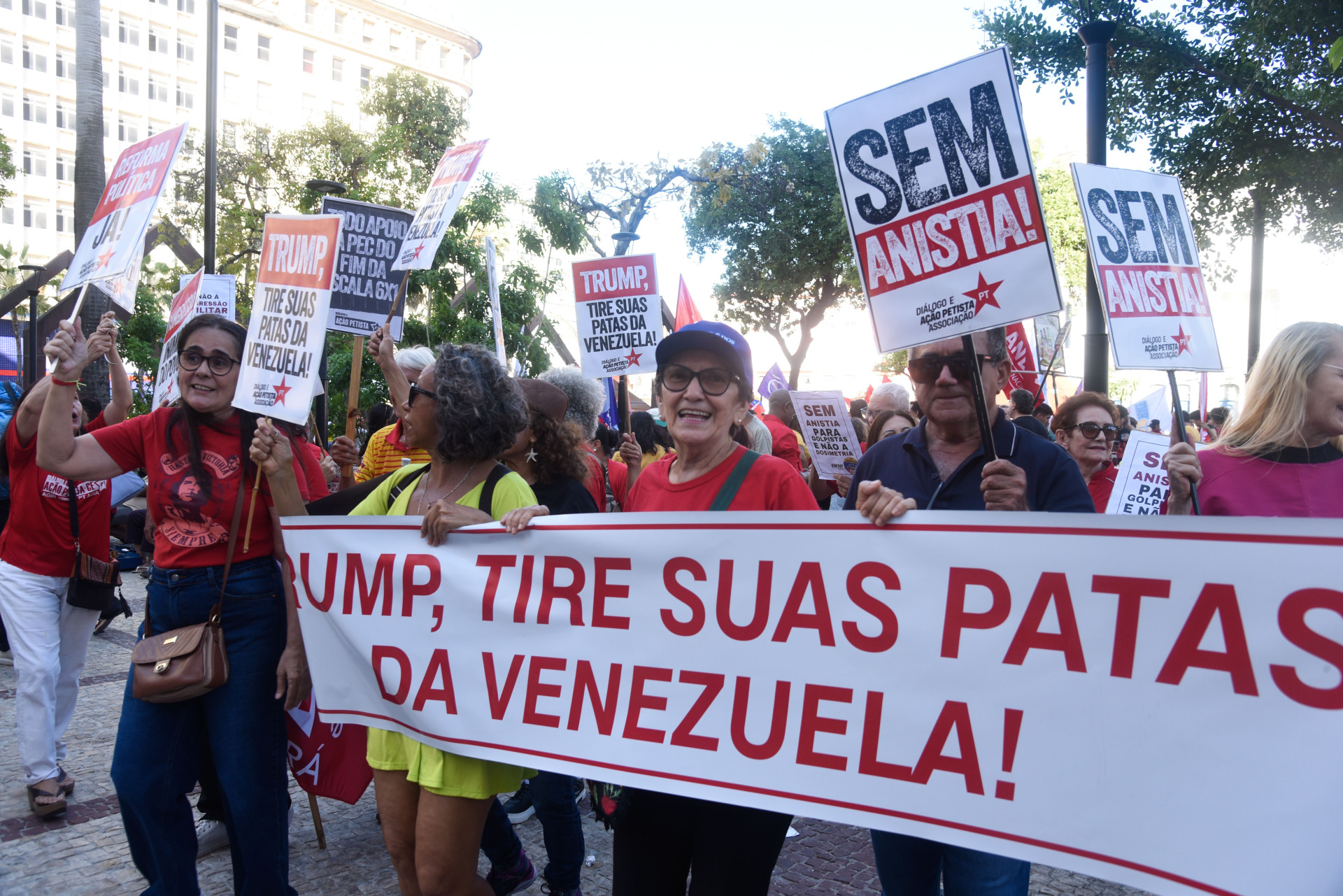 A Praça do Ferreira reuniu militantes e políticos, entre eles o deputado estadual Guilherme Sampaio (PT), líder do governo na Assembleia Legislativa do Ceará (Alece). O petista considerou que o veto de Lula ao Projeto de Lei (PL) da Dosimetria, assinado nesta quinta em Brasília, atende a expectativa do povo brasileiro.