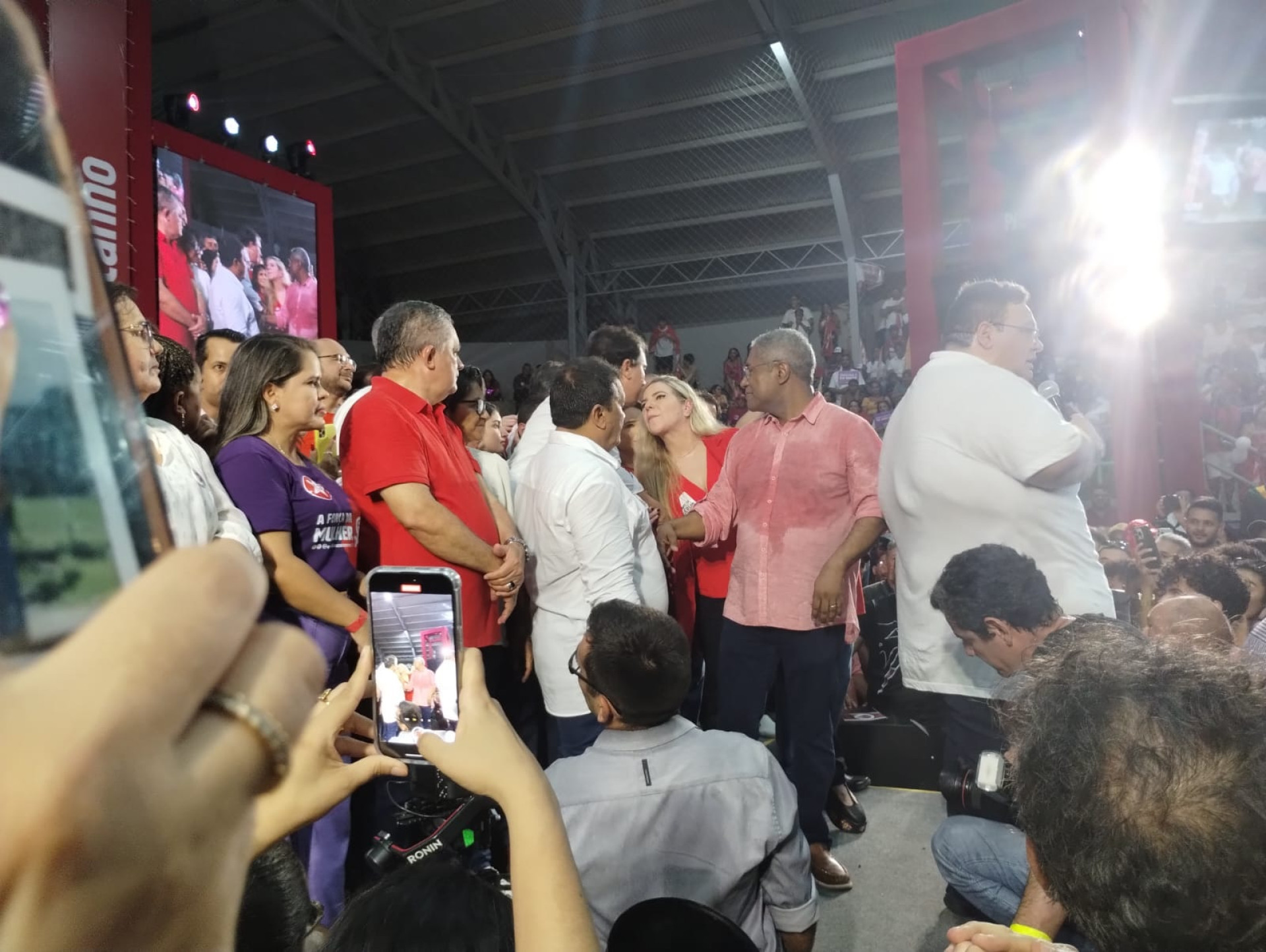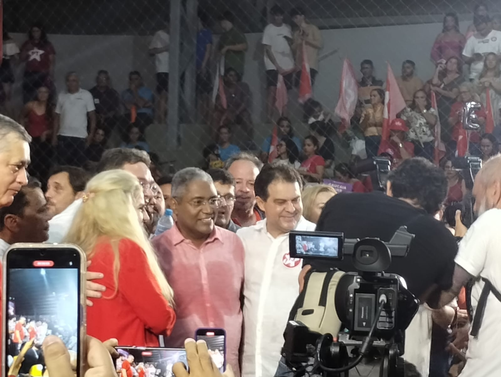 Luizianne sobe no palanque com Evandro e Camilo na convenção de Catanho em Caucaia