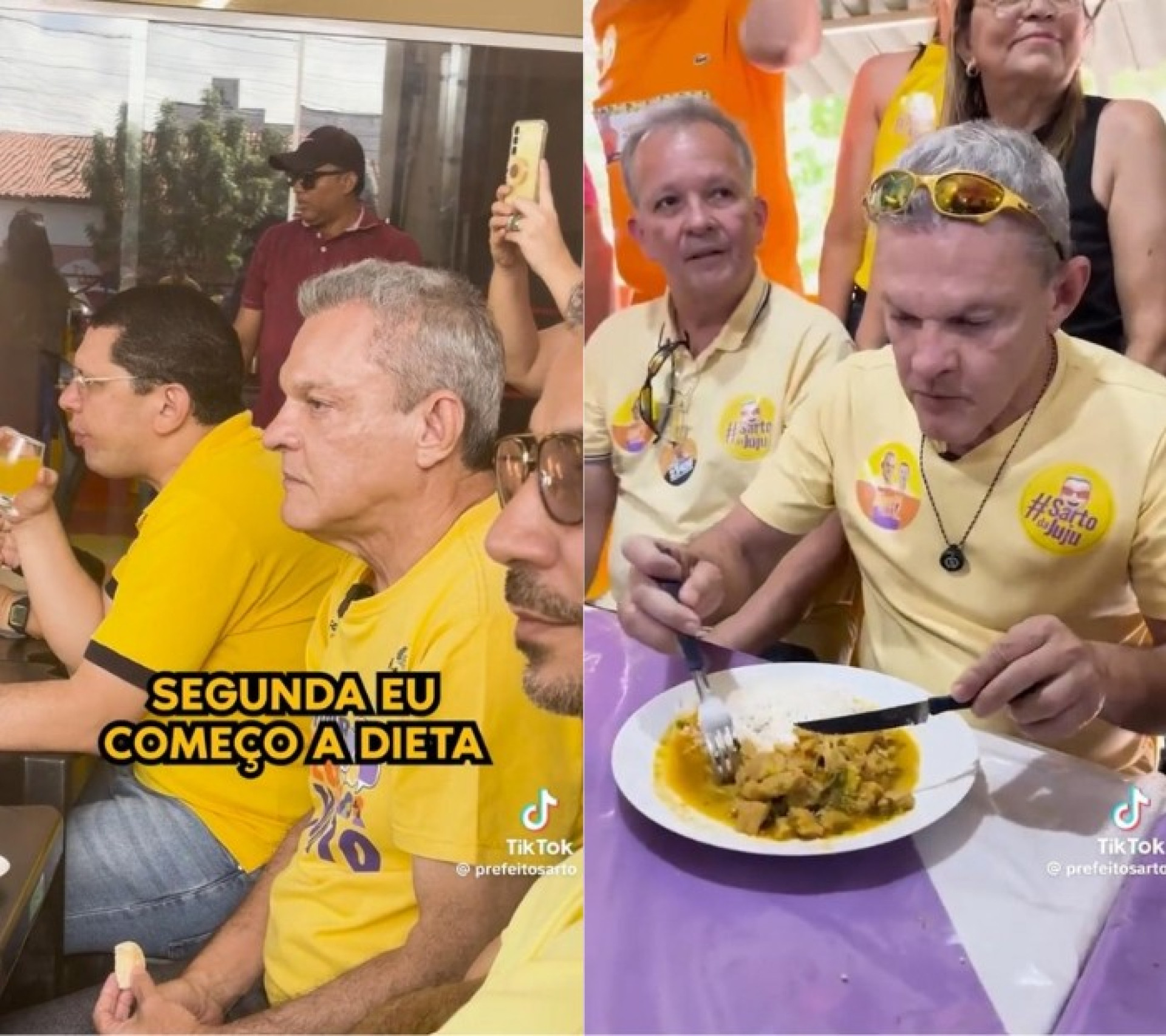 Na outra postagem, na mesma rede social, o candidato aparece comendo, com o áudio dizendo: "Segunda eu começo a dieta, porque dieta para mim é muito difícil, gente. Eu odeio fazer dieta, eu gosto de comer muito, eu gosto de comer muito doce. Aí gente, é tão difícil...". Nas imagens, Sarto aparece "traçando" panelada, pipoca e milho verde em eventos pelas ruas da Capital.