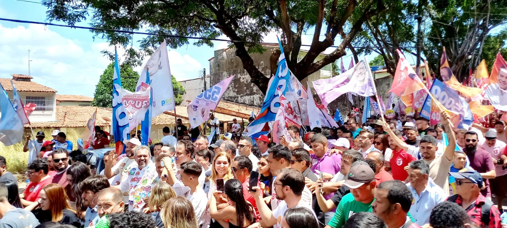 Camilo, Evandro, Elmano e Gabriella Aguiar chegaram juntos ao ato na traseira de um carro. Sem coletiva de imprensa, desceram do veículo e começaram a caminhada pelas ruas do bairro Antônio Bezerra, área sobre a qual o opositor Adail Jr. (PDT), vereador aliado de Sarto, tem grande influência.