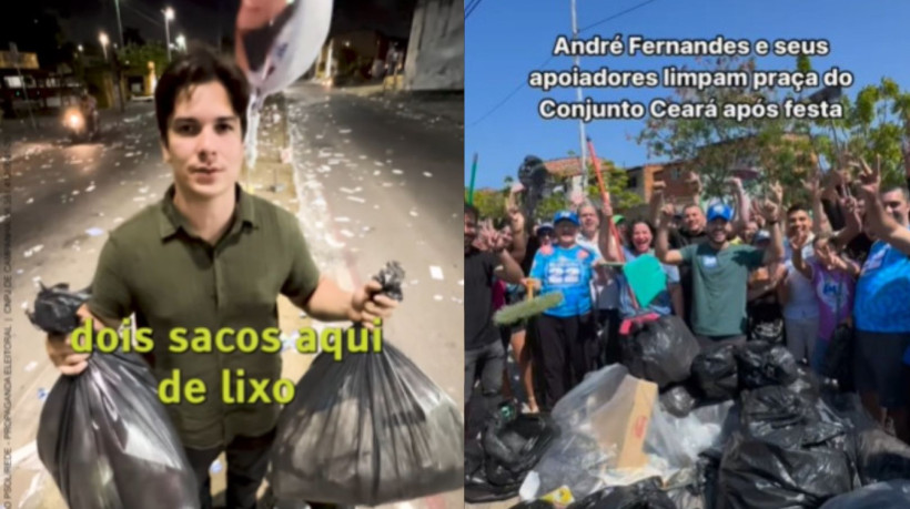 Após ato realizado na noite desse sábado, 21, pelo candidato André Fernandes (PL) com a presença do deputado federal Nikolas Ferreira (PL-MG), o vereador Gabriel Aguiar (Psol) foi às redes sociais denunciar sujeira deixada na Praça da Caixa Econômica, no bairro Conjunto Ceará, em Fortaleza. Na tarde deste domingo, 22, o candidato a prefeito de Fortaleza publicou vídeo limpando o local.